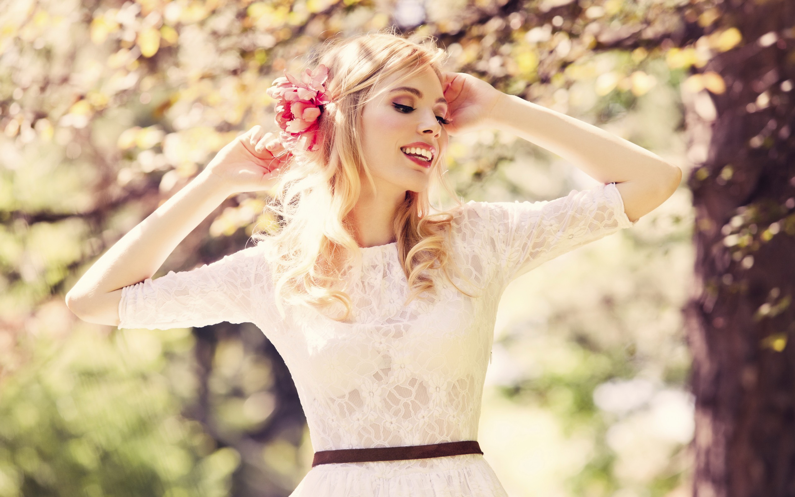 Description: A woman in a white dress is holding her hair in her hand and smiling at the camera while standing in a park.