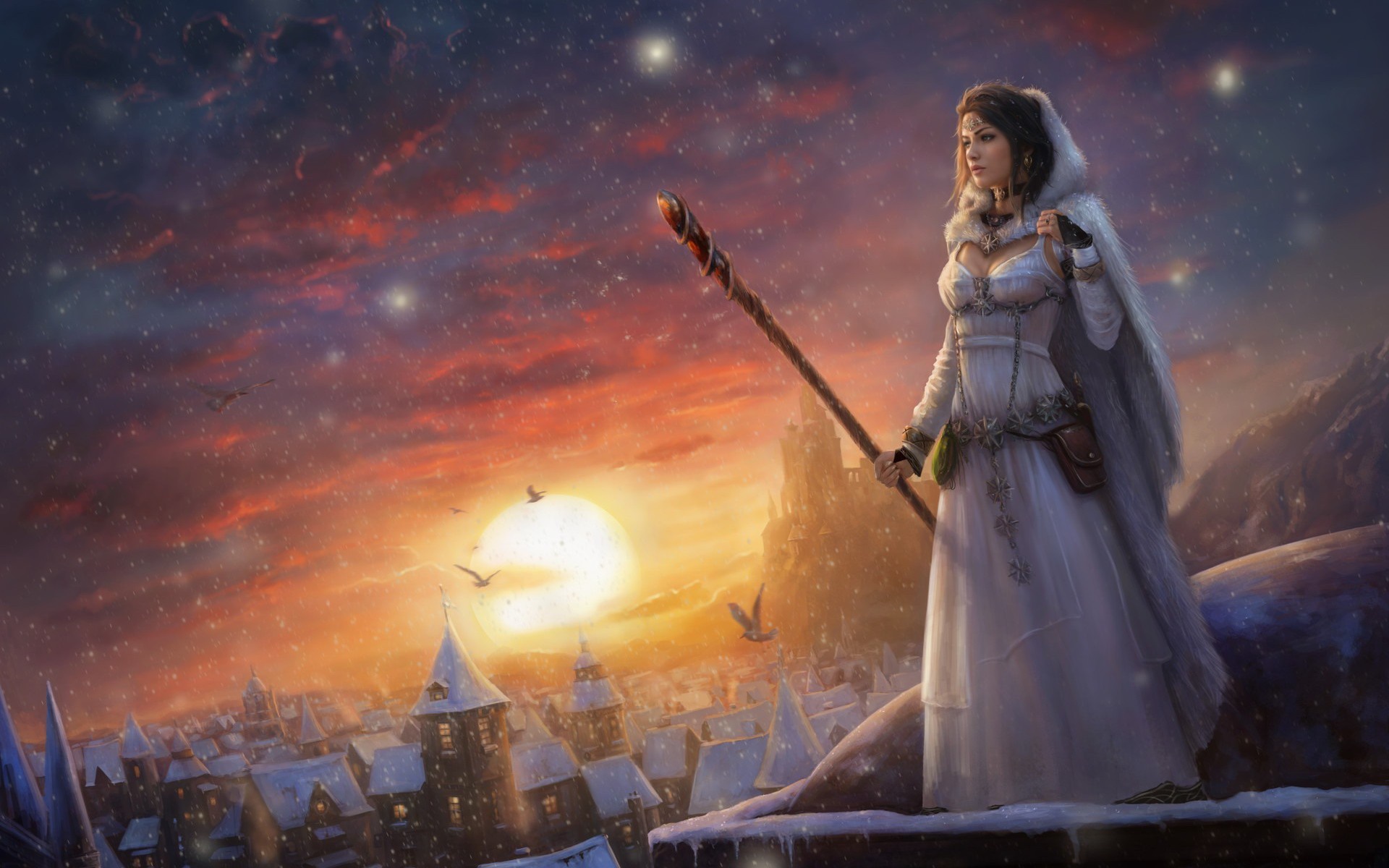 Description: A painting of a woman in a white dress holding a stick in front of a sunset and a city.