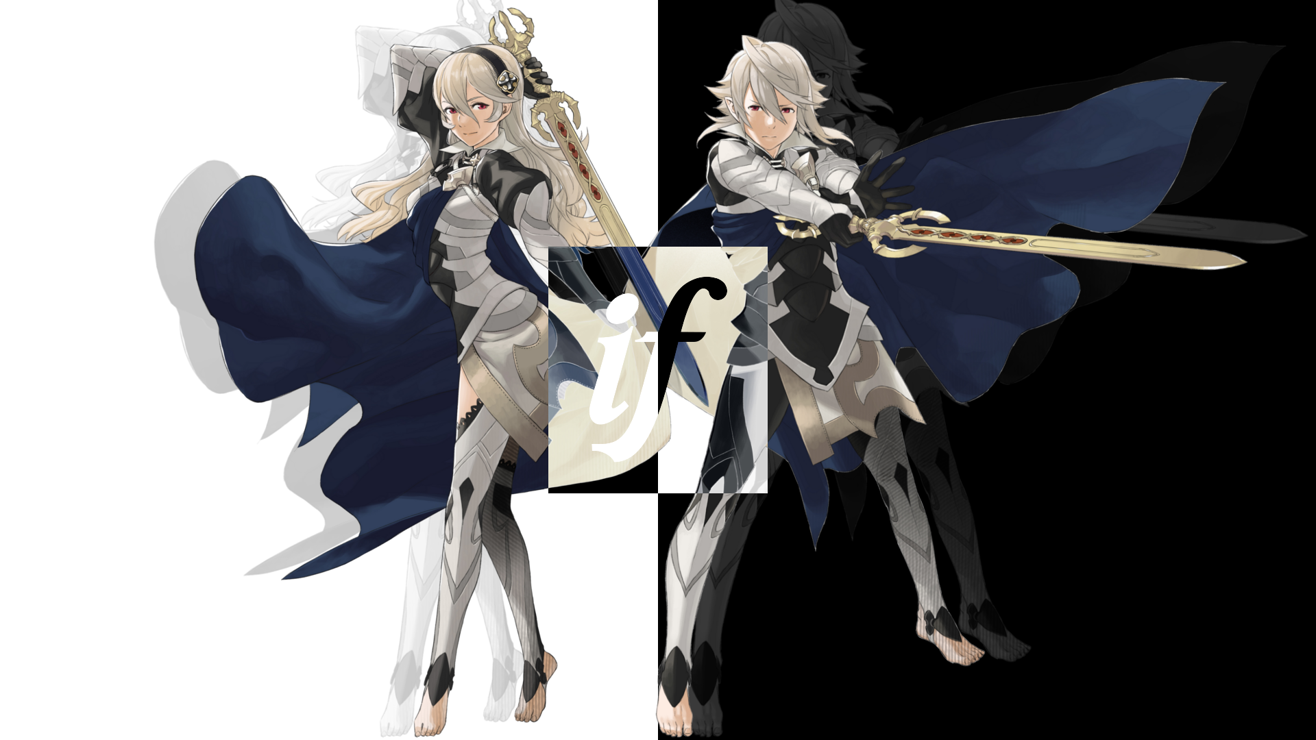 Description: A woman in a white dress holding a sword and a sword in her hand and a black and white background.