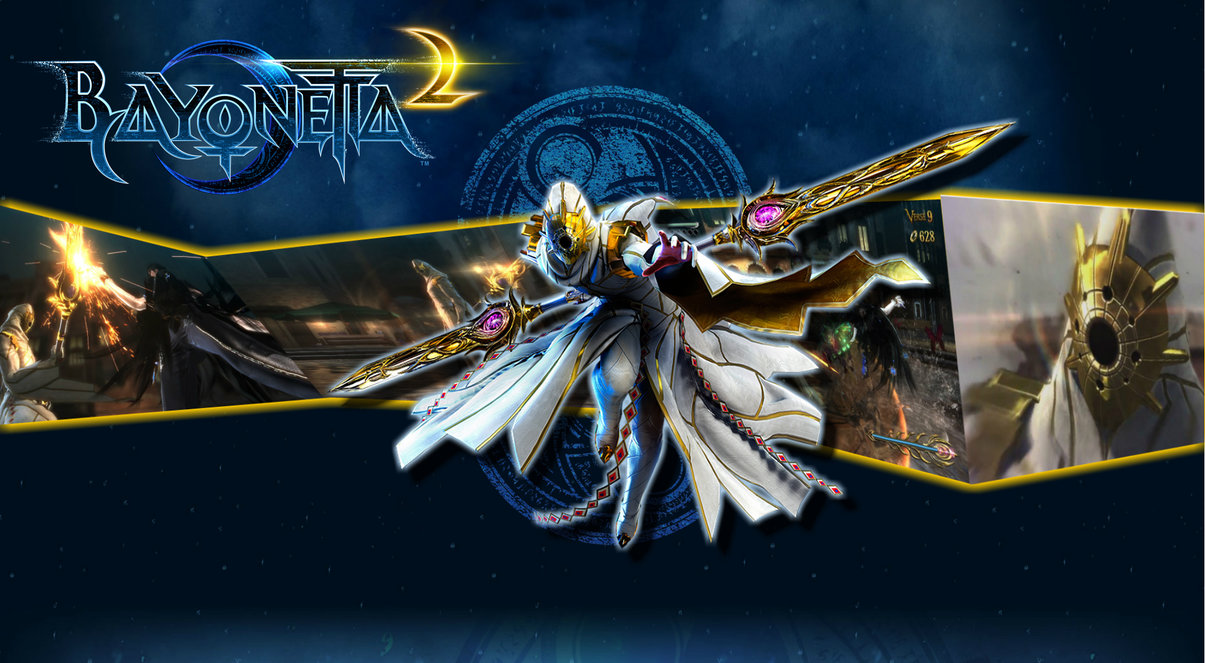 Description: A woman in a white dress holding a sword and a sword in her hand with a blue background and a yellow border.