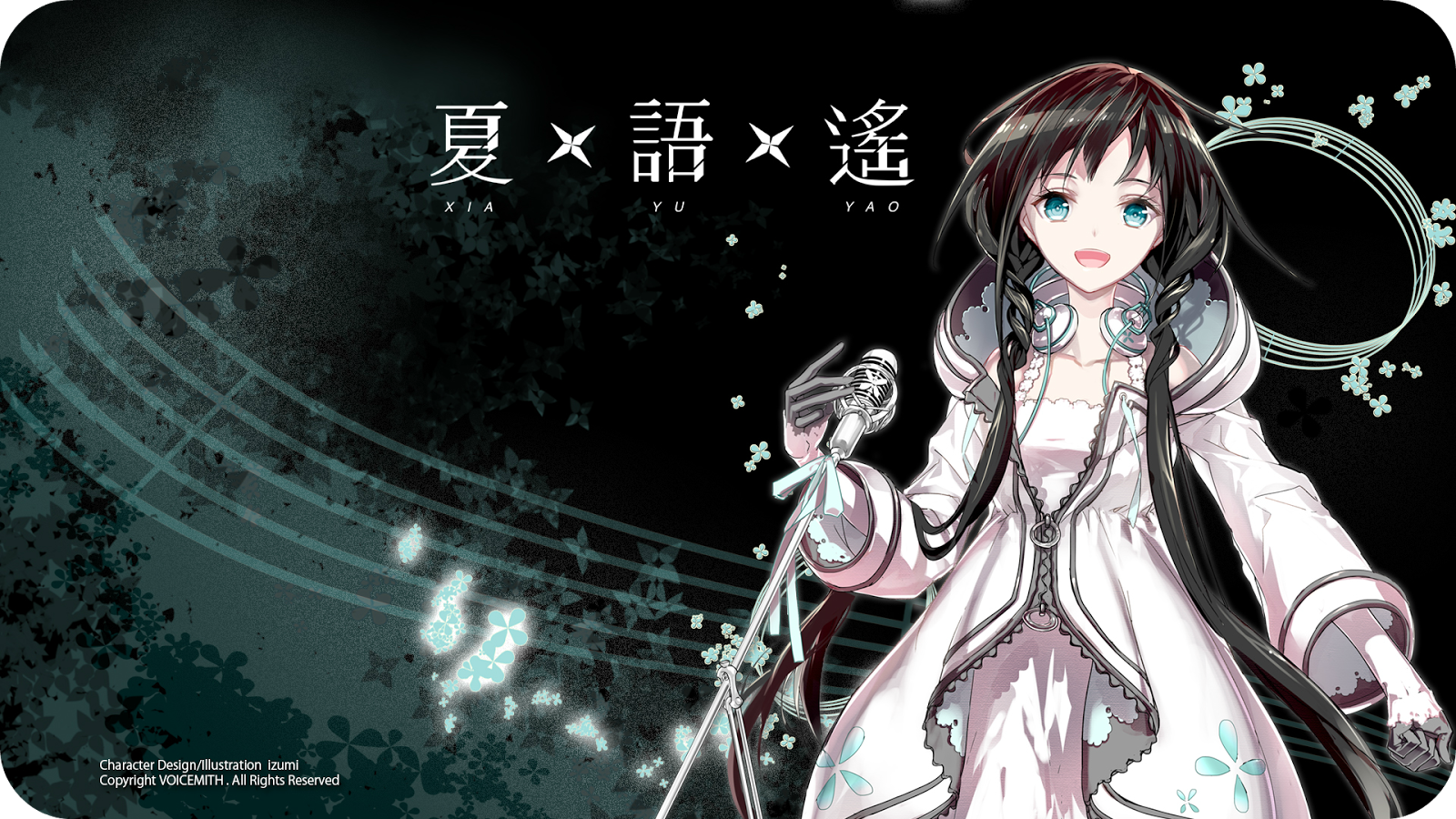 Description: A woman in a white dress holding a sword and a black background with chinese characters on it and a black background with white and blue lines.
