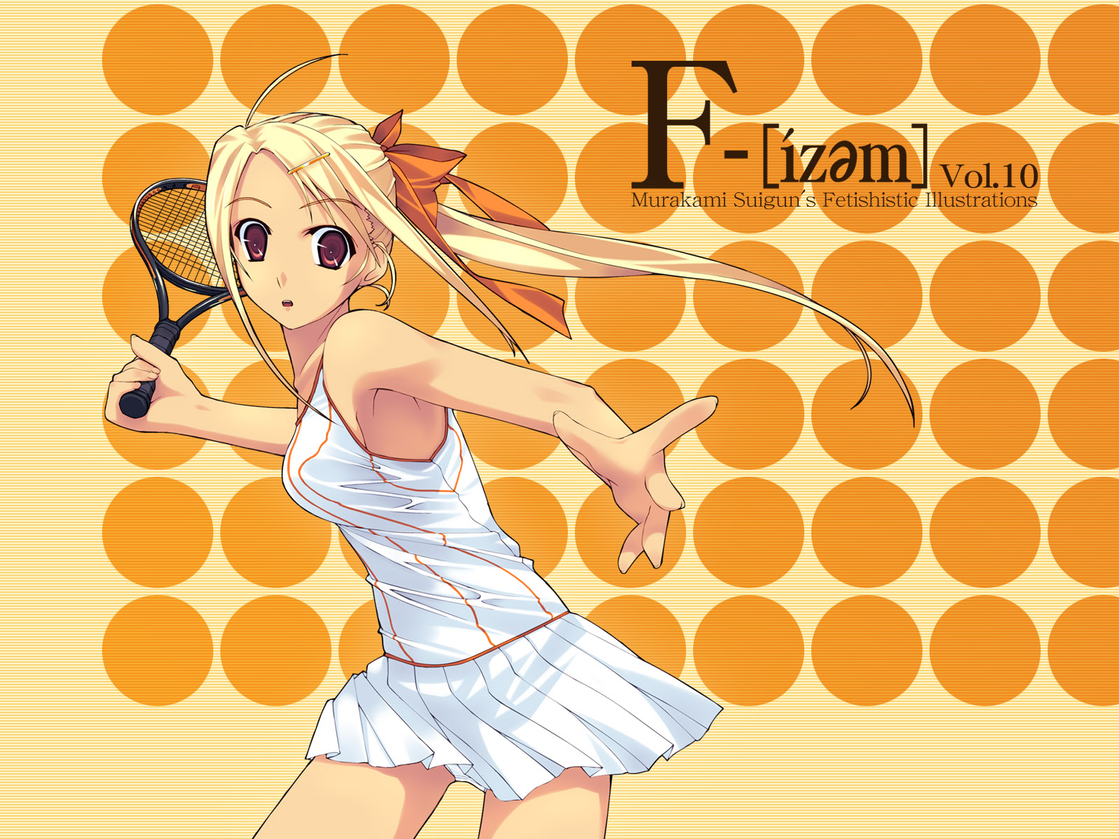 Description: A woman in a white dress holding a tennis racquet on a yellow background with circles of circles.