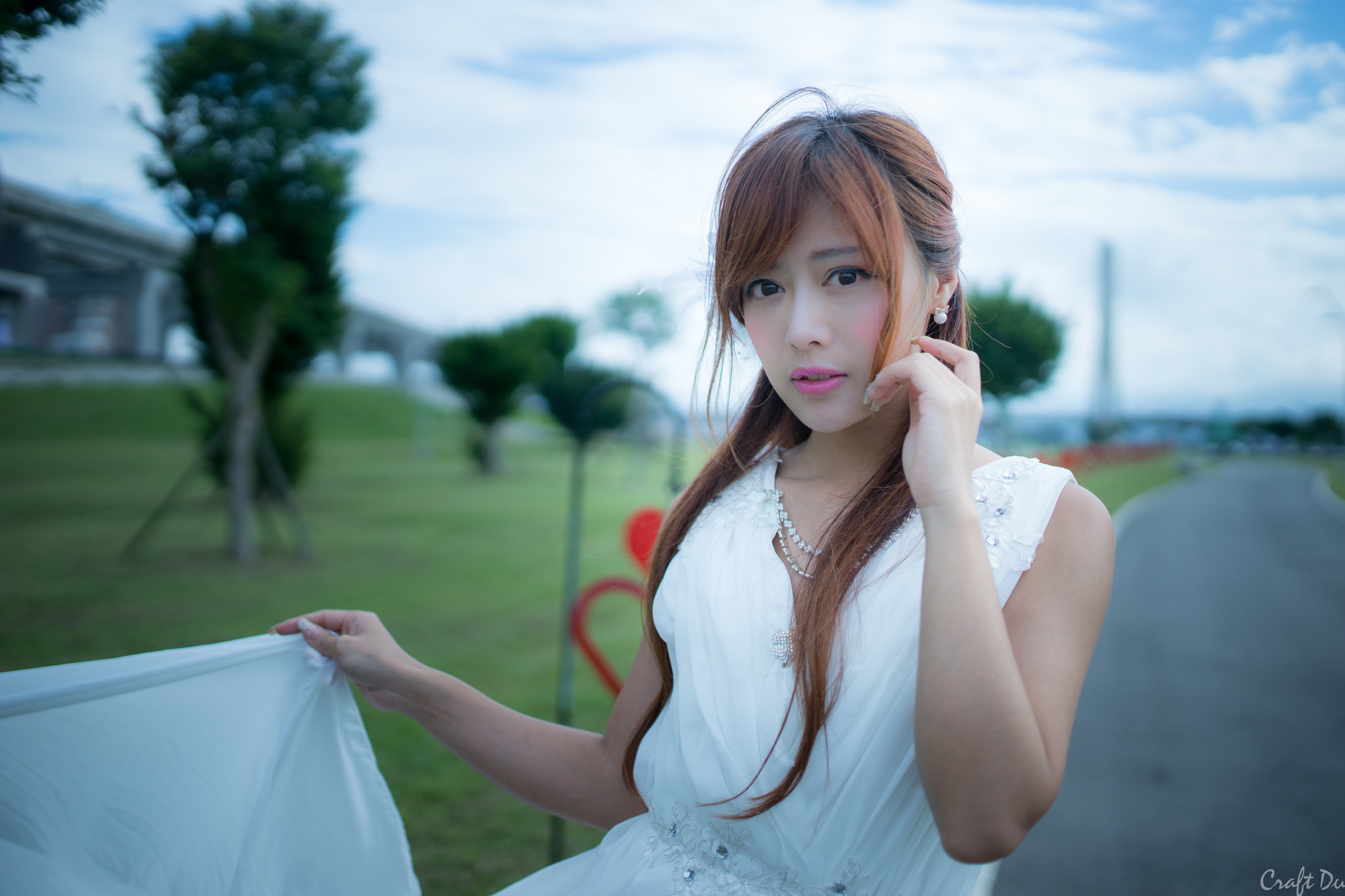 Description: A woman in a white dress holding a white umbrella in her hand and looking at the camera with a serious look on her face.