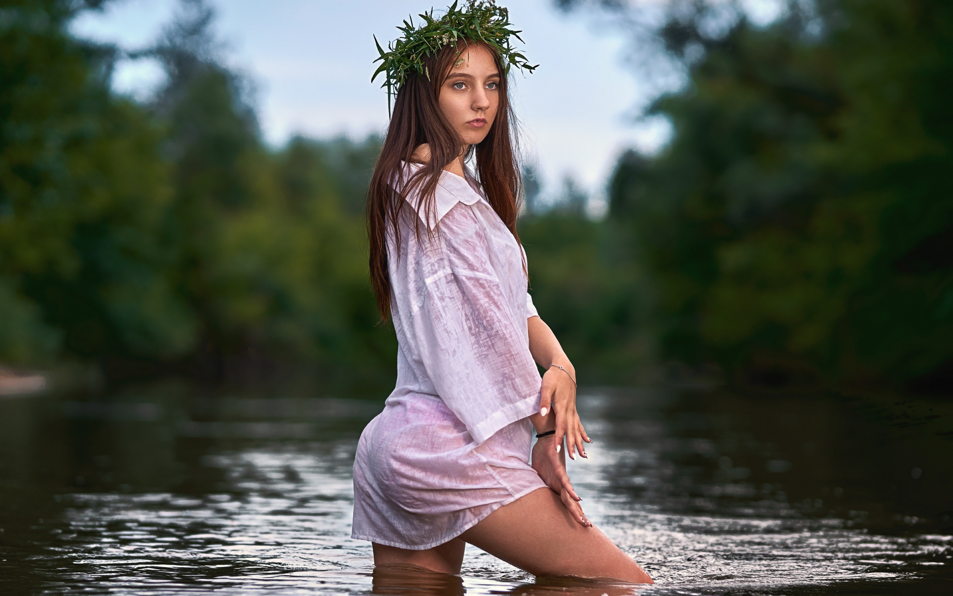 Description: A woman in a white dress is in the water with a crown on her head and a wreath of leaves on her head.