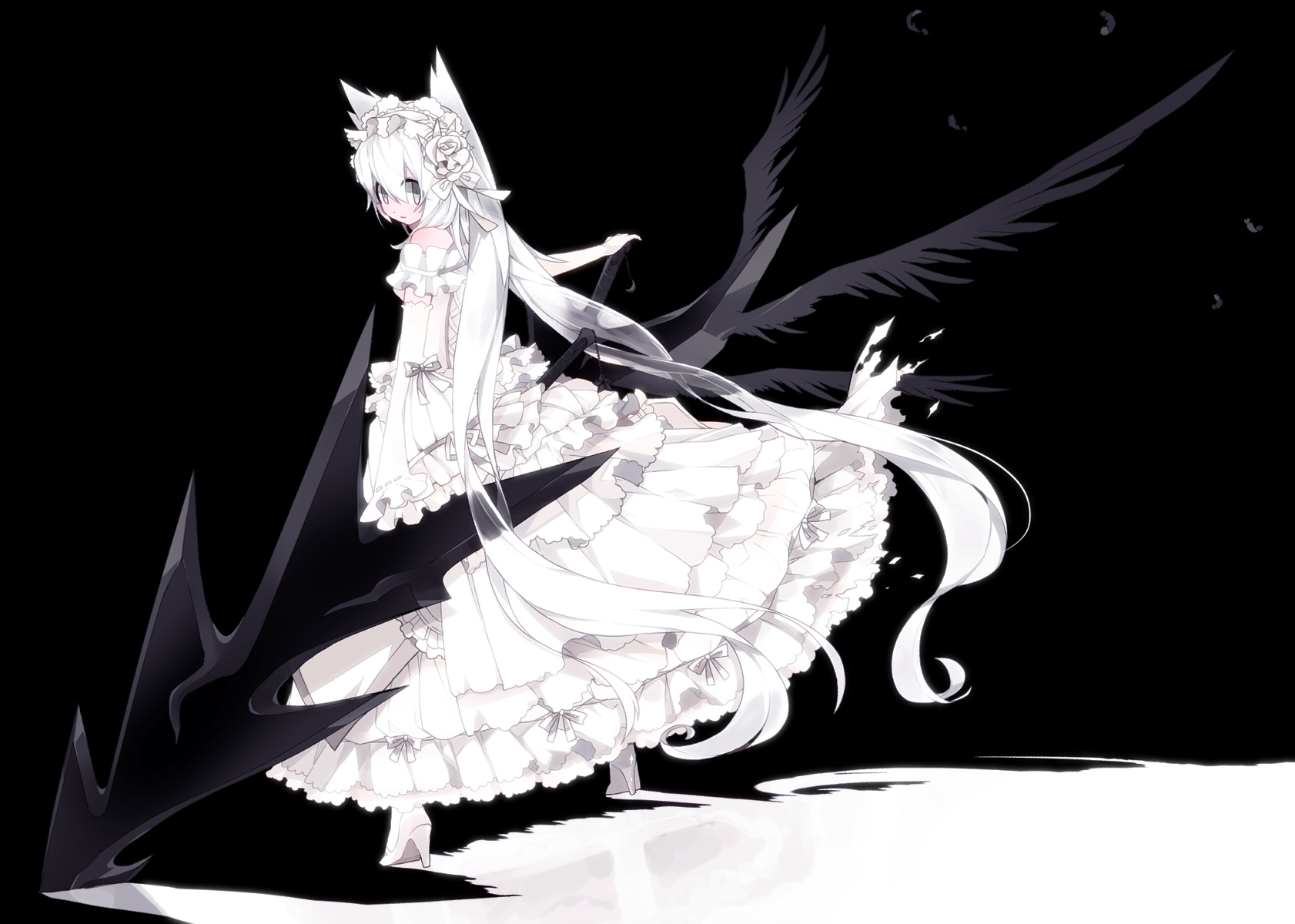Description: A woman in a white dress with wings on her back and a black background with a white bird flying over her.