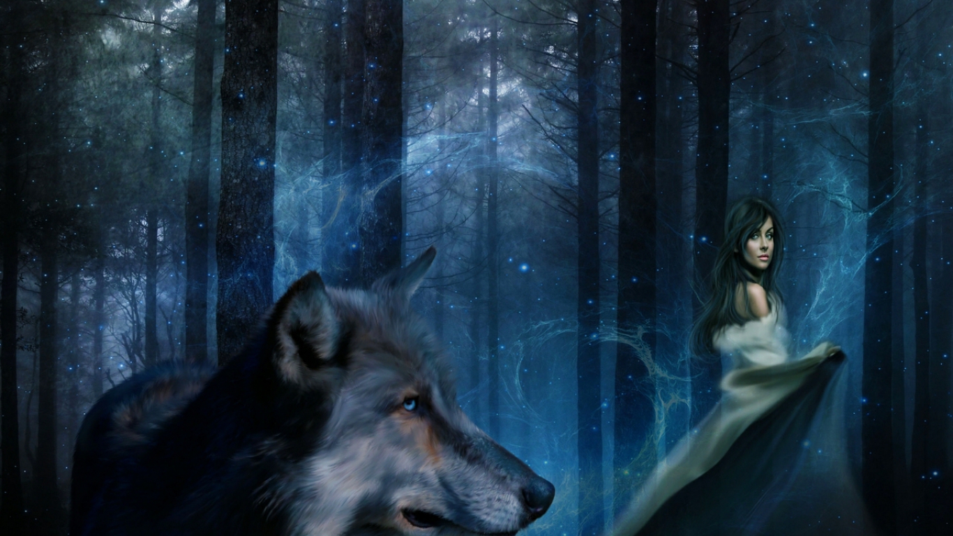 Description: A woman in a white dress standing next to a wolf in a forest with stars on the sky and trees.