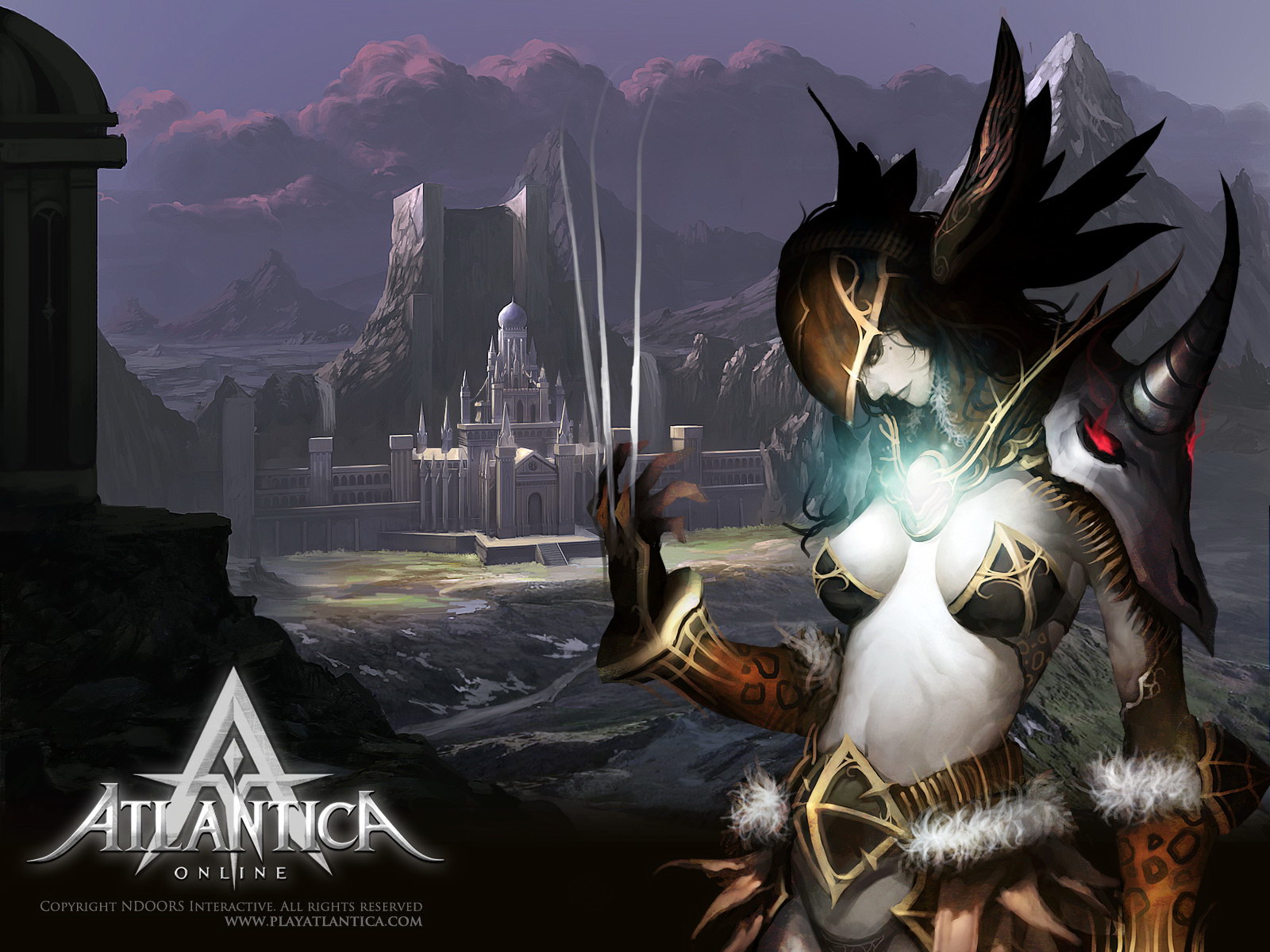 Description: A woman in a white and gold outfit holding a sword in front of a castle with mountains in the background.