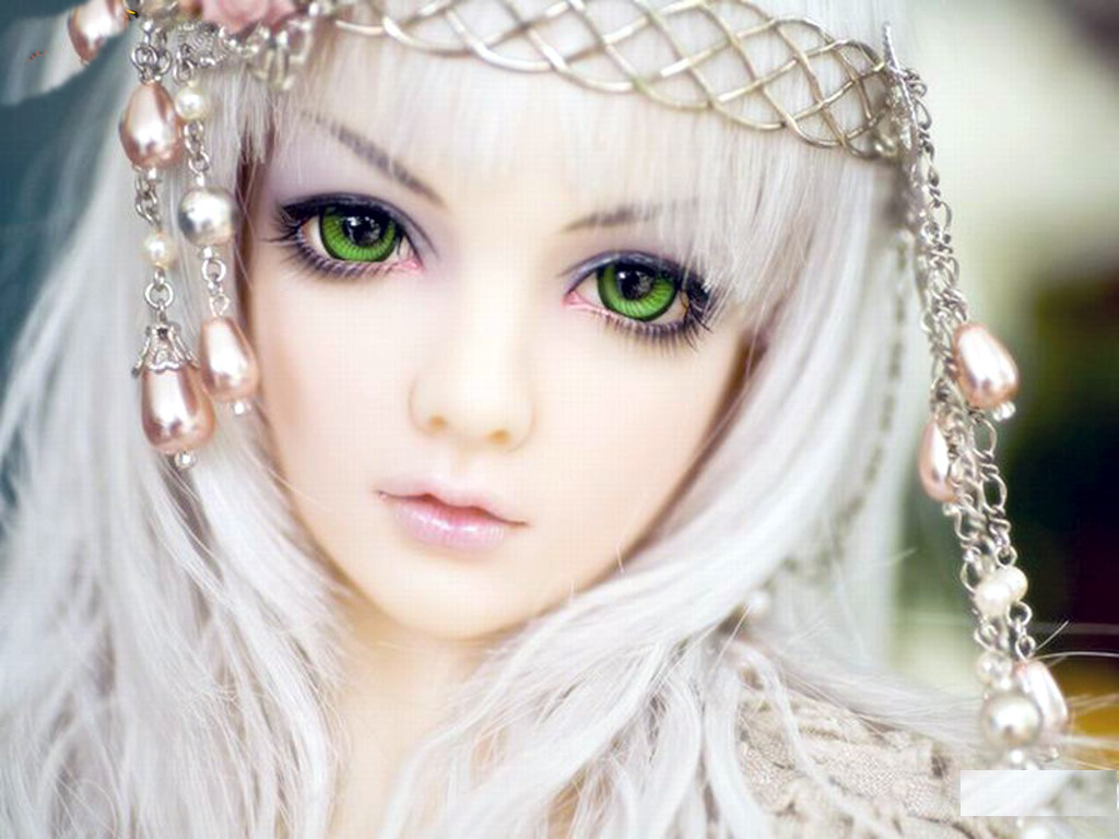Description: A woman with white hair and green eyes wearing a head piece with pearls and pearls on it's head.