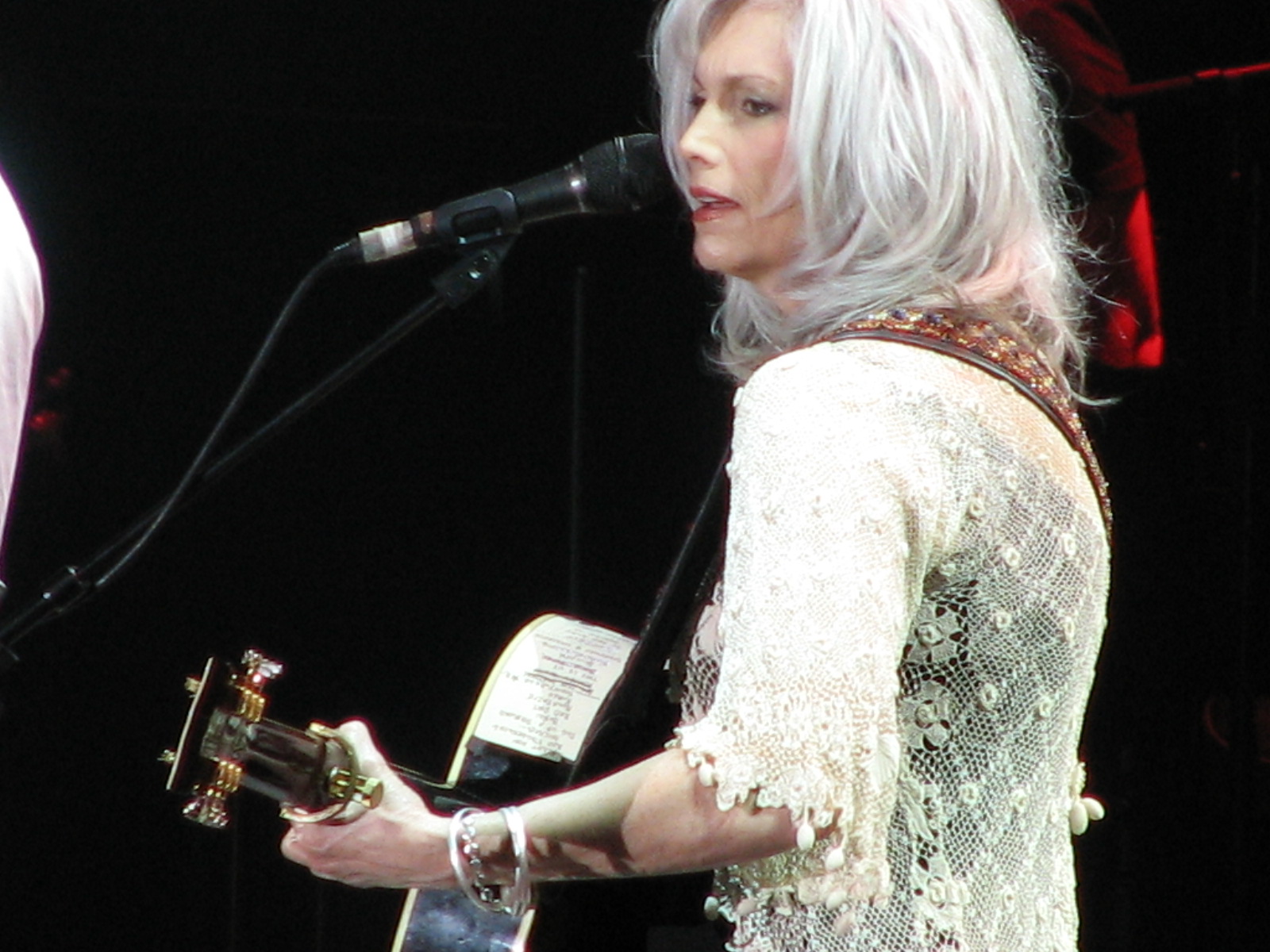 Description: A woman with white hair playing a guitar and singing into a microphone at a concert with a microphone in front of her.