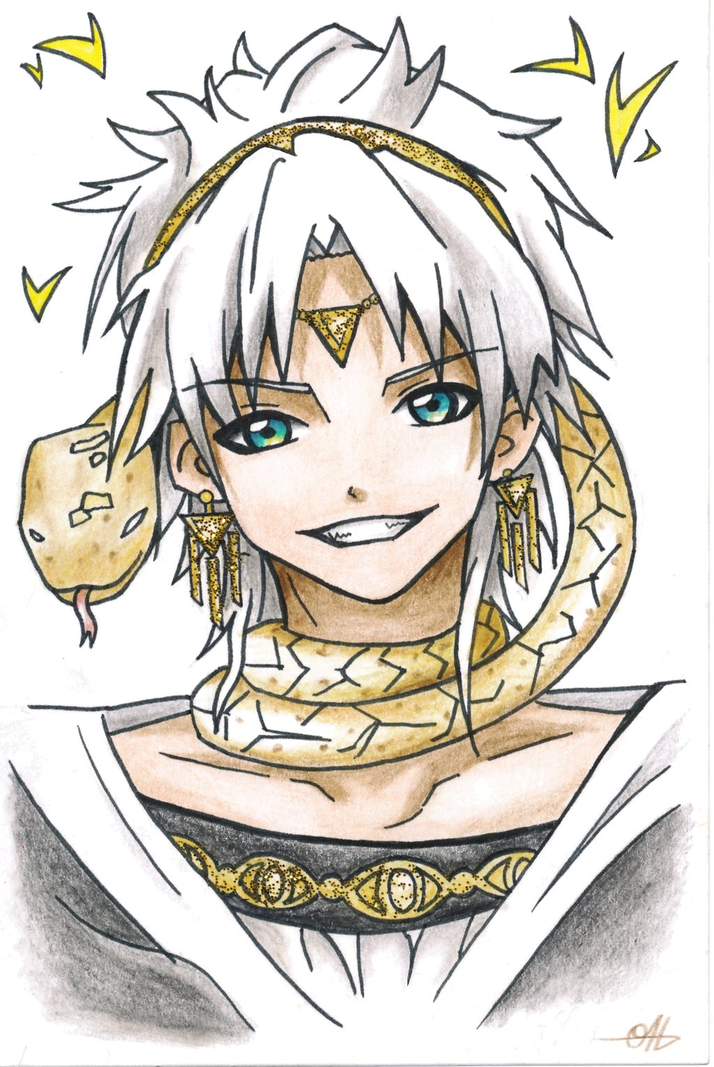Description: A drawing of a woman with white hair and a snake around her neck and a snake on her head.
