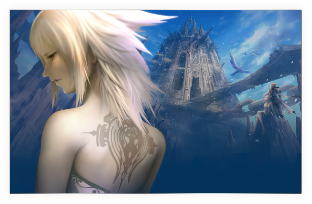 Description: A woman with white hair and a tattoo on her back standing in front of a castle with a giant clock tower.