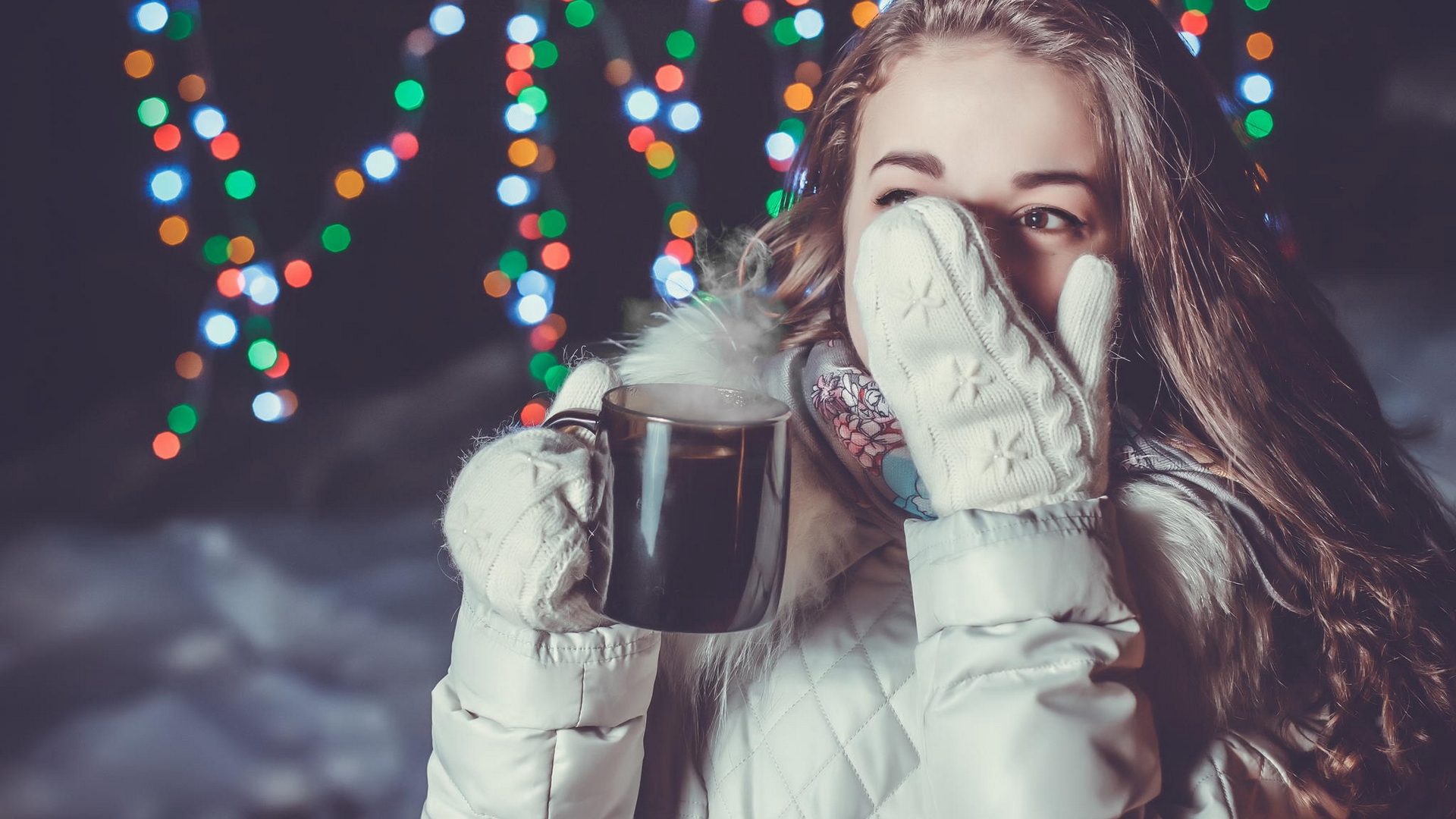 Description: A woman in a white jacket holding a glass of drink in her hand and a christmas tree in the background.