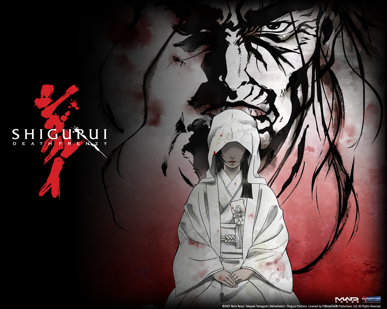 Description: A woman in a white robe standing in front of a red background with a demon on it's face.