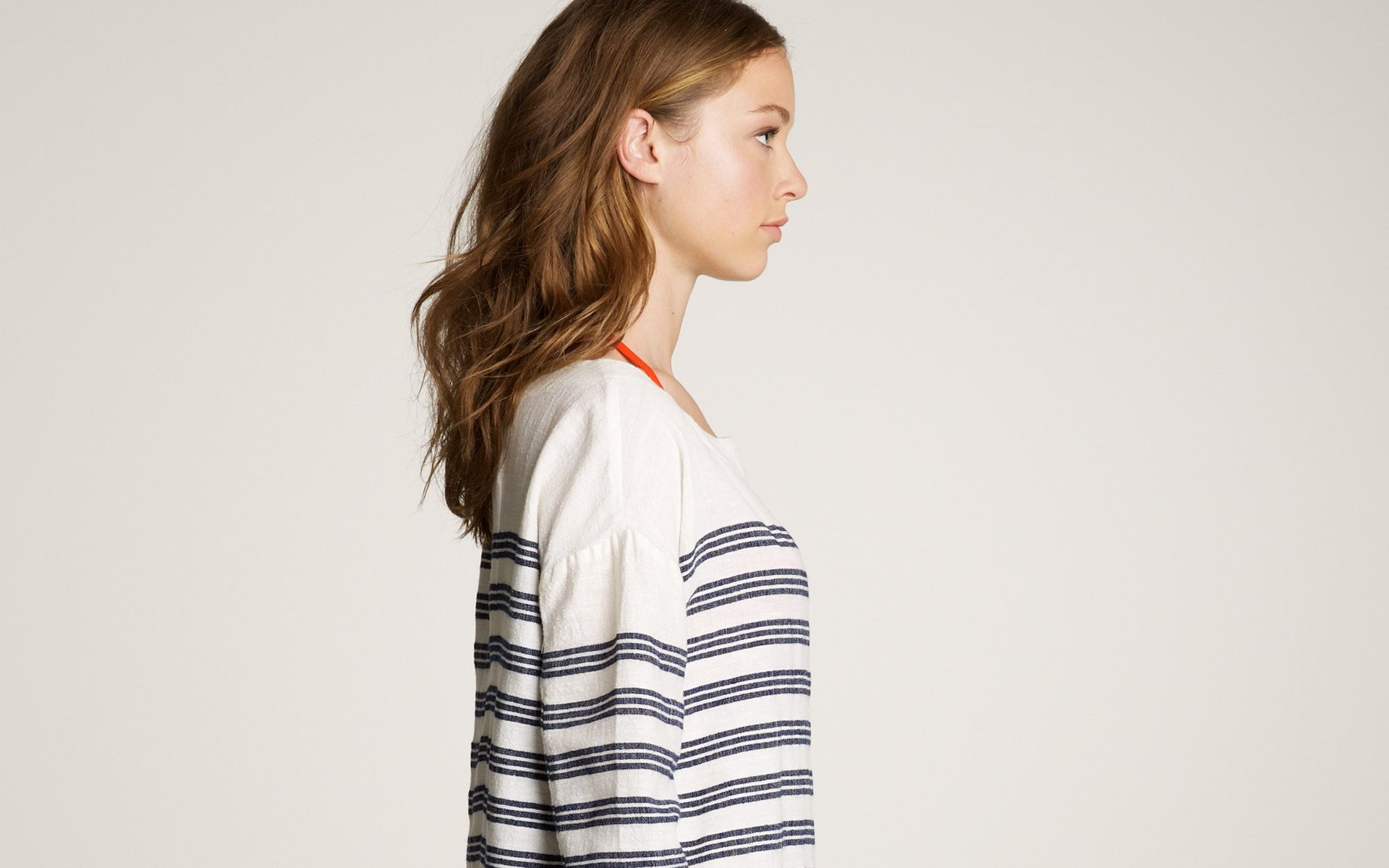 Description: A woman in a white shirt and black pants is looking away from the camera with a serious look on her face.
