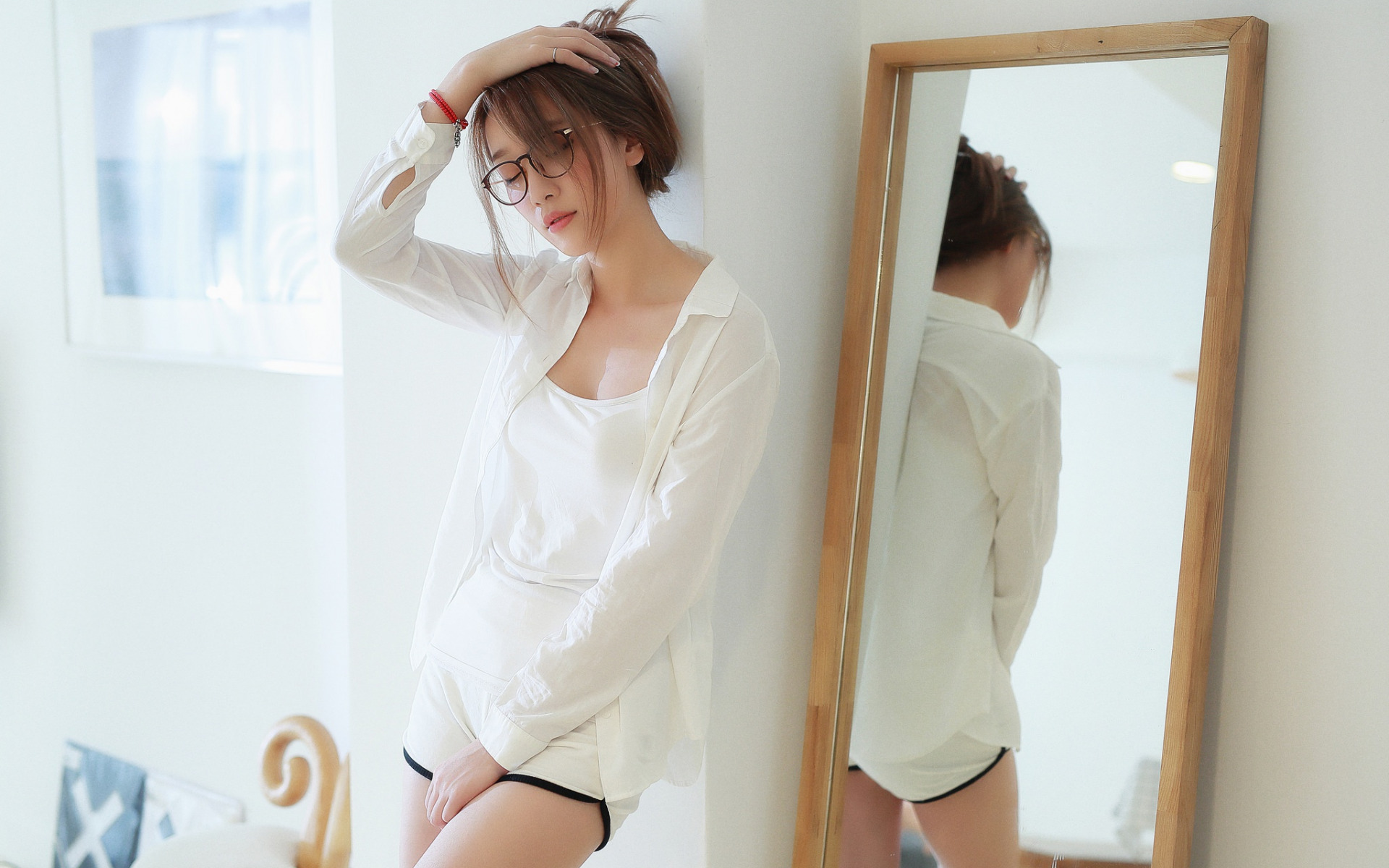 Description: A woman in a white shirt and black shorts standing in front of a mirror with her reflection in the mirror.