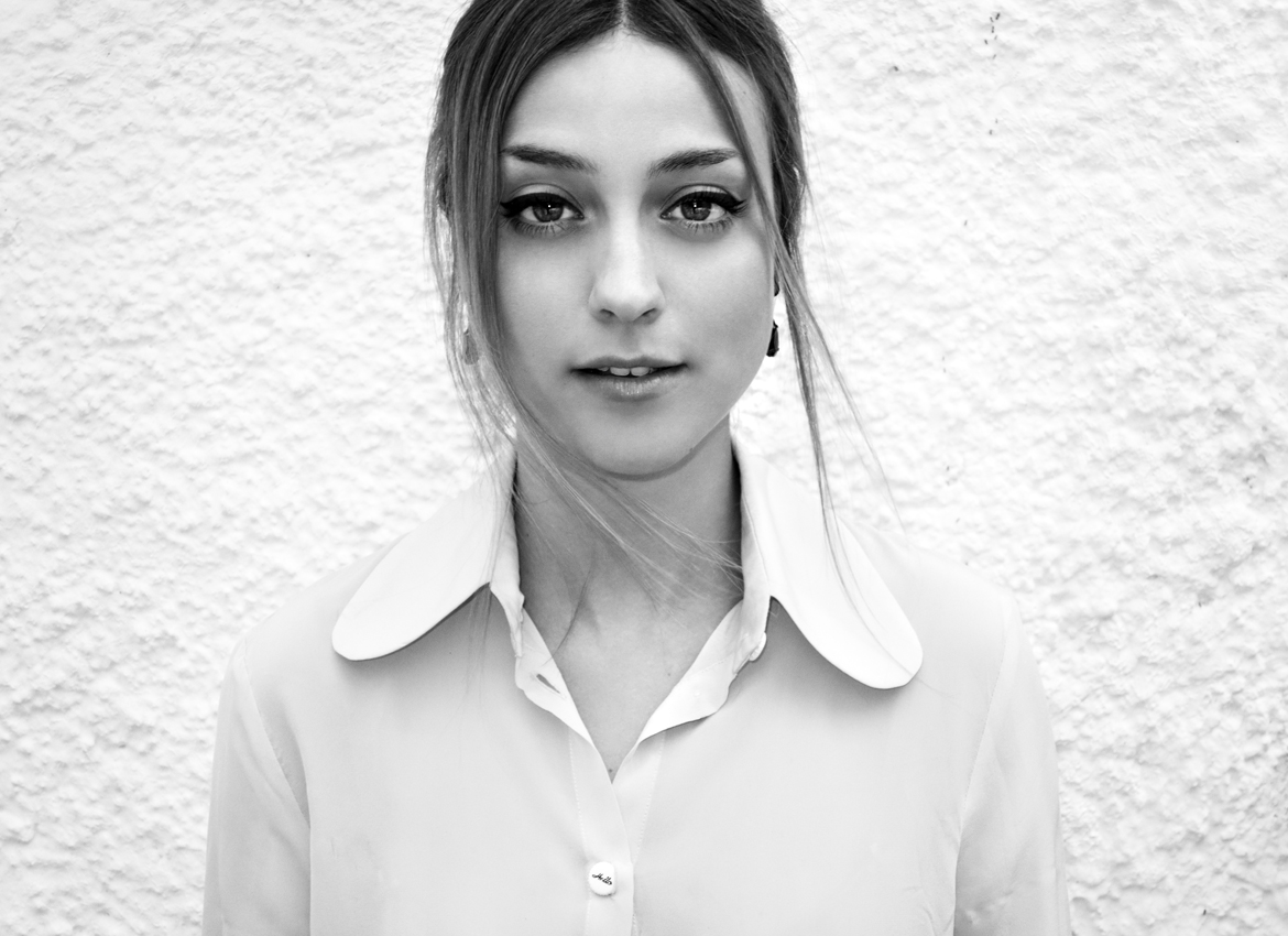 Description: A woman with a white shirt and a black tie on her neck and a white wall behind her and a white wall behind her.