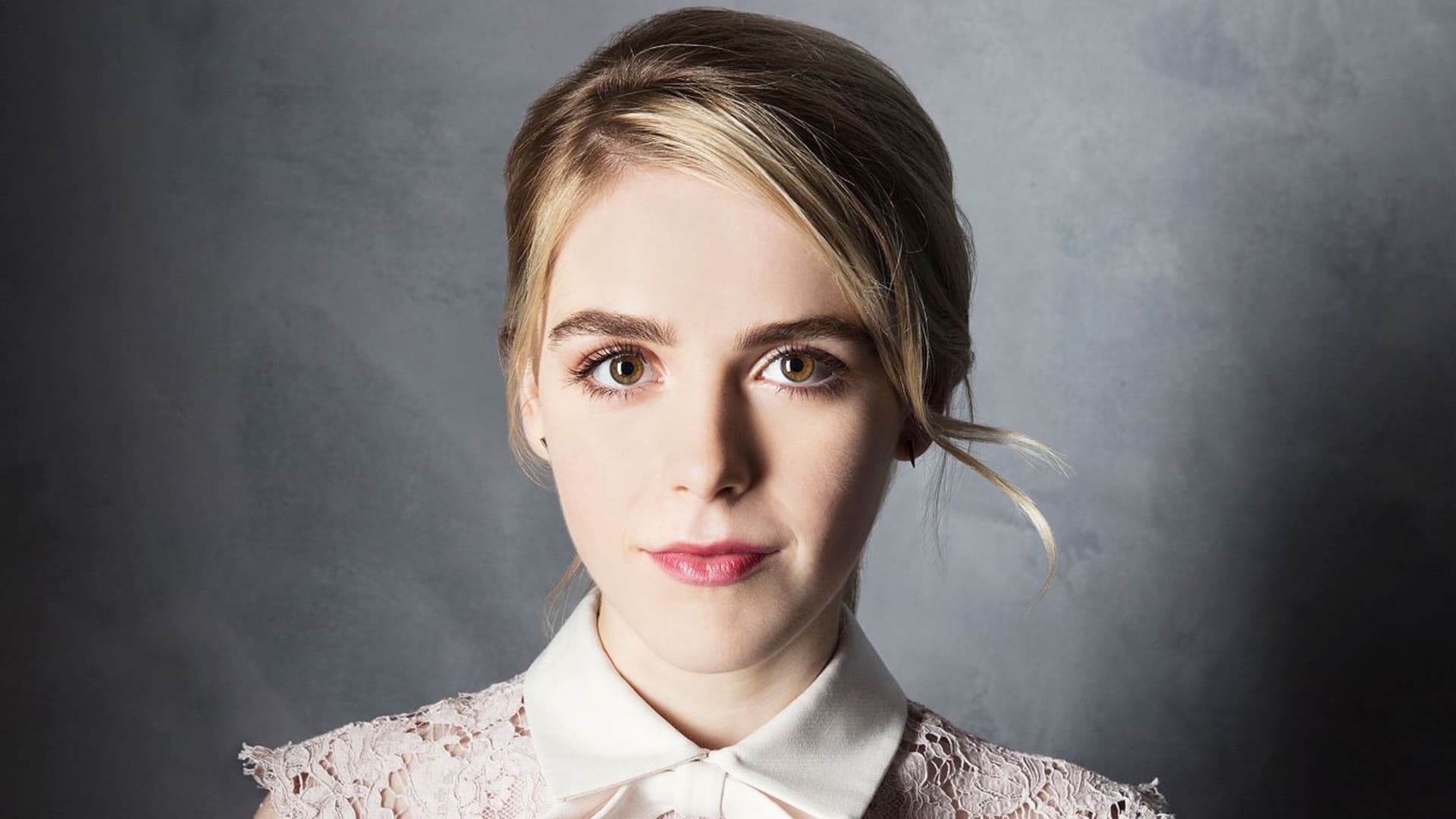 Description: A woman with a white shirt and a bow tie on her neck and a black background with a gray backdrop.