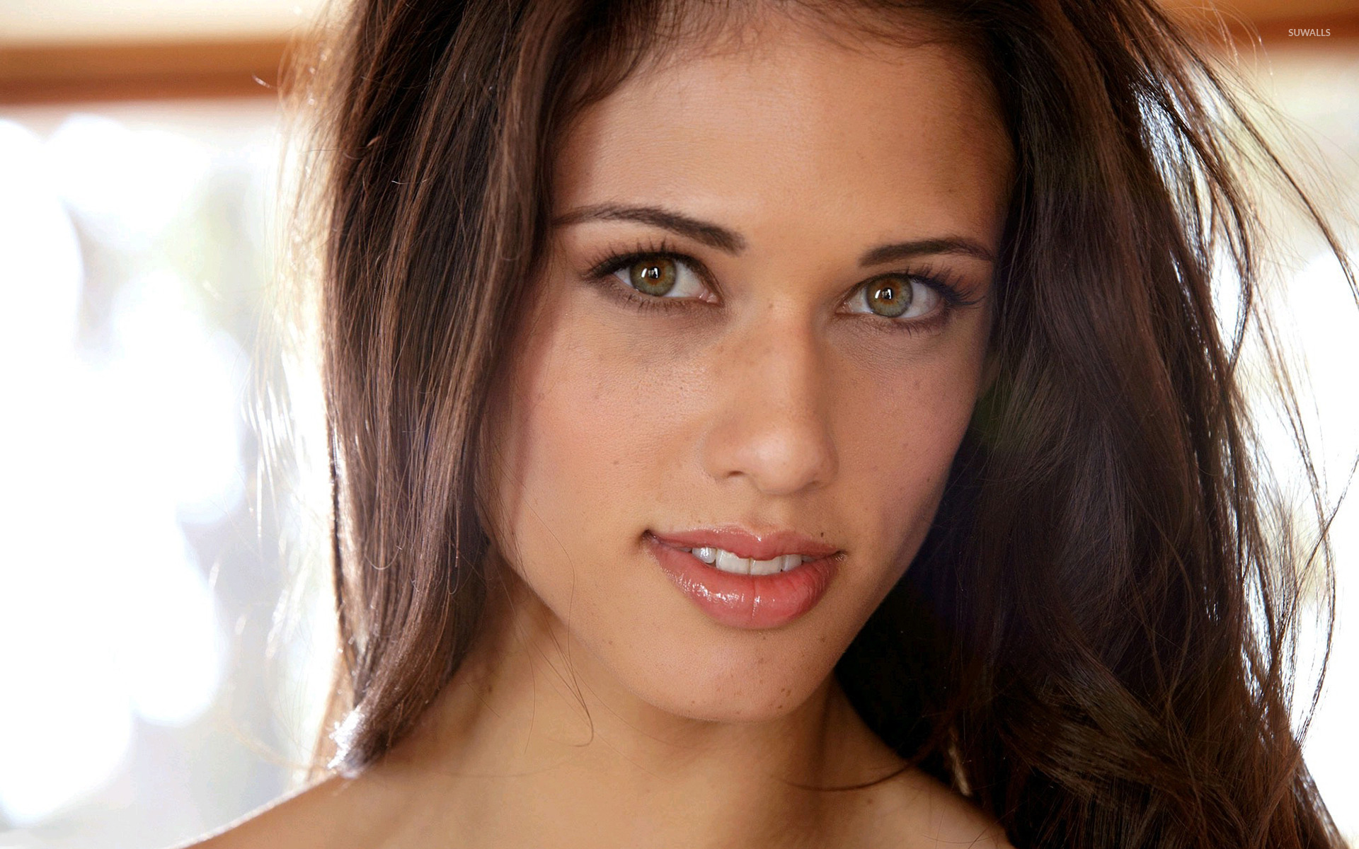 Description: A woman with a white shirt and a brown hair is posing for a picture with her hair in the wind.