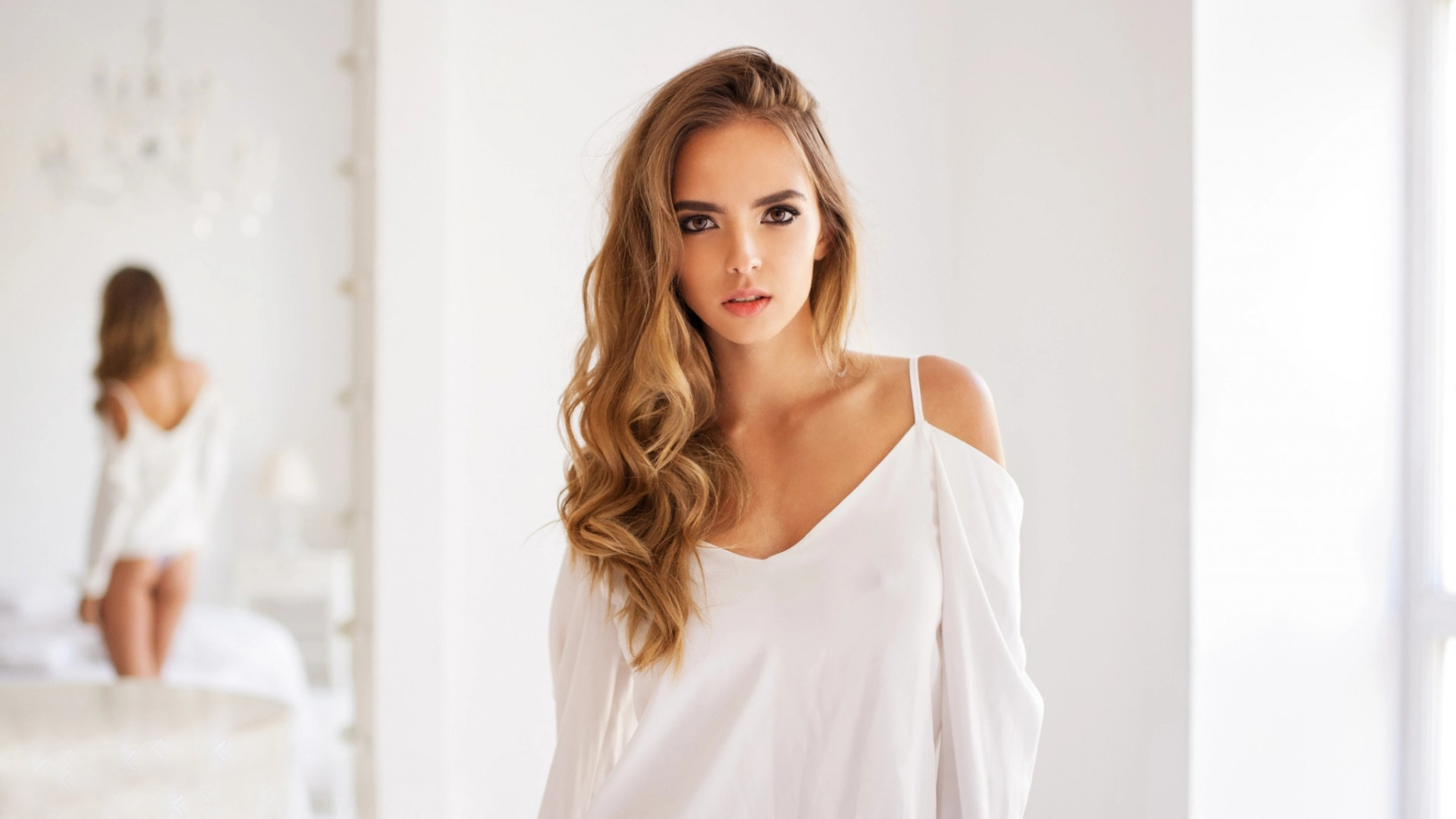 Description: A woman in a white shirt standing in a room with a cake and a woman in the background looking at the camera.