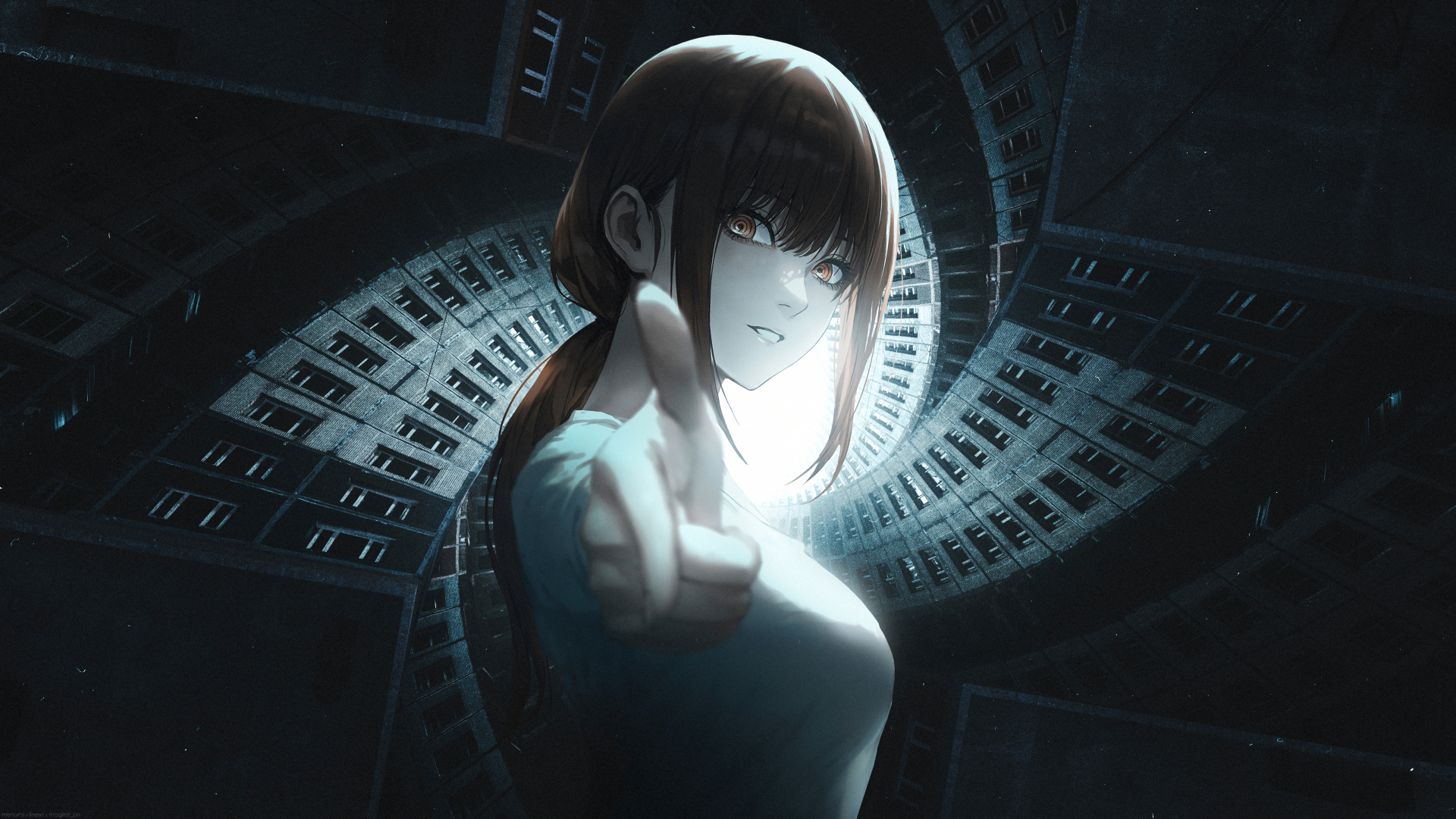 Description: A woman in a white shirt pointing at something in the dark room with a window behind her and a building in the background.
