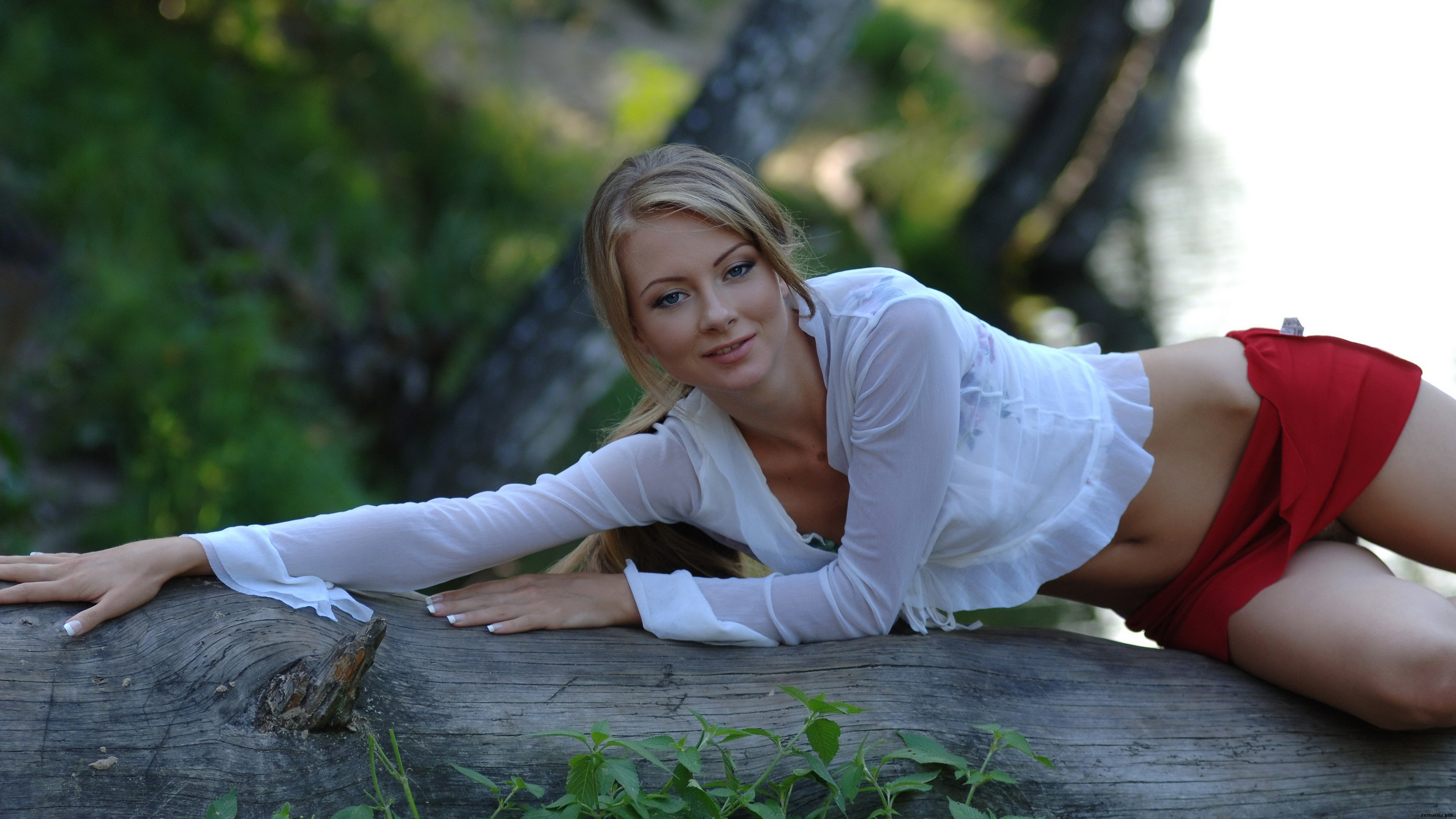 Description: A woman in a white shirt and red skirt leaning on a log in the woods with her hand on her hip.