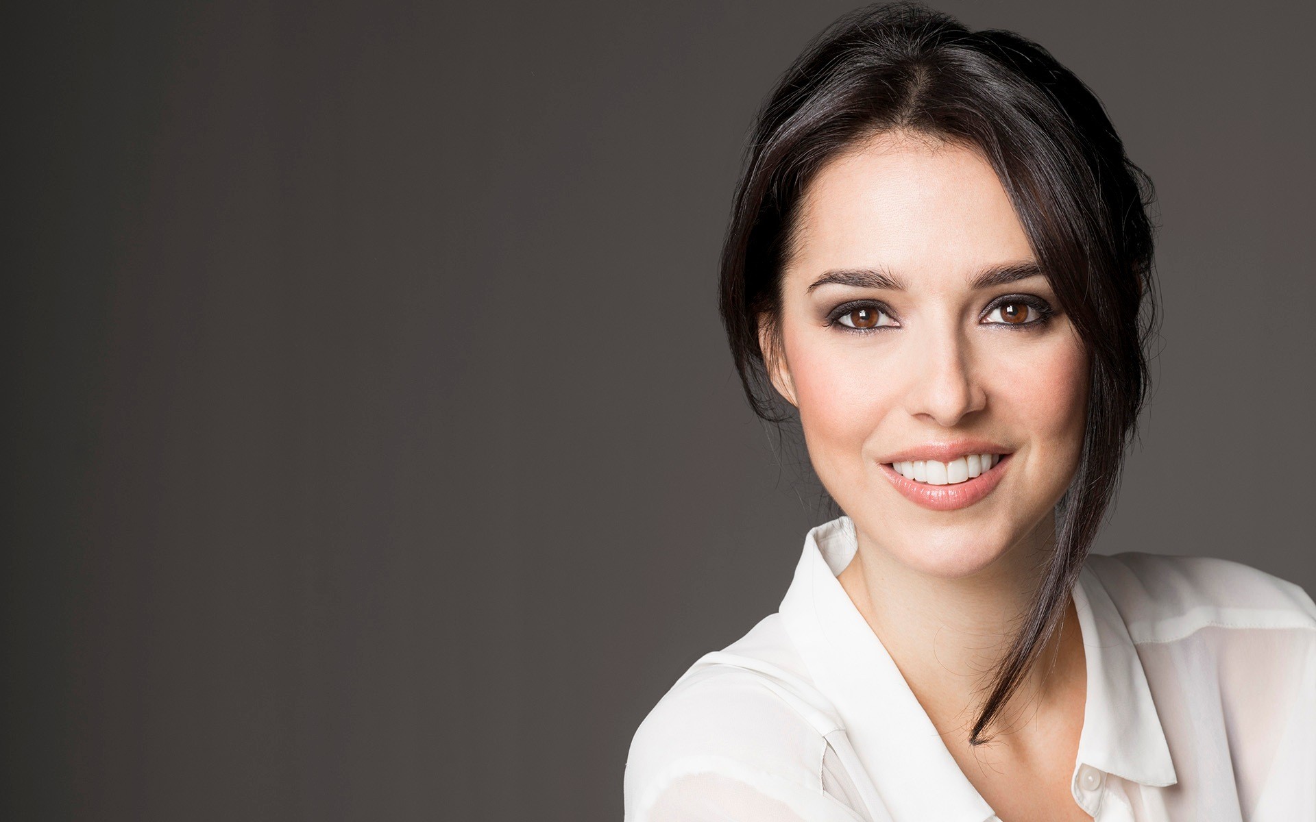 Description: A woman with a white shirt and a smile on her face and a black background with a gray background.
