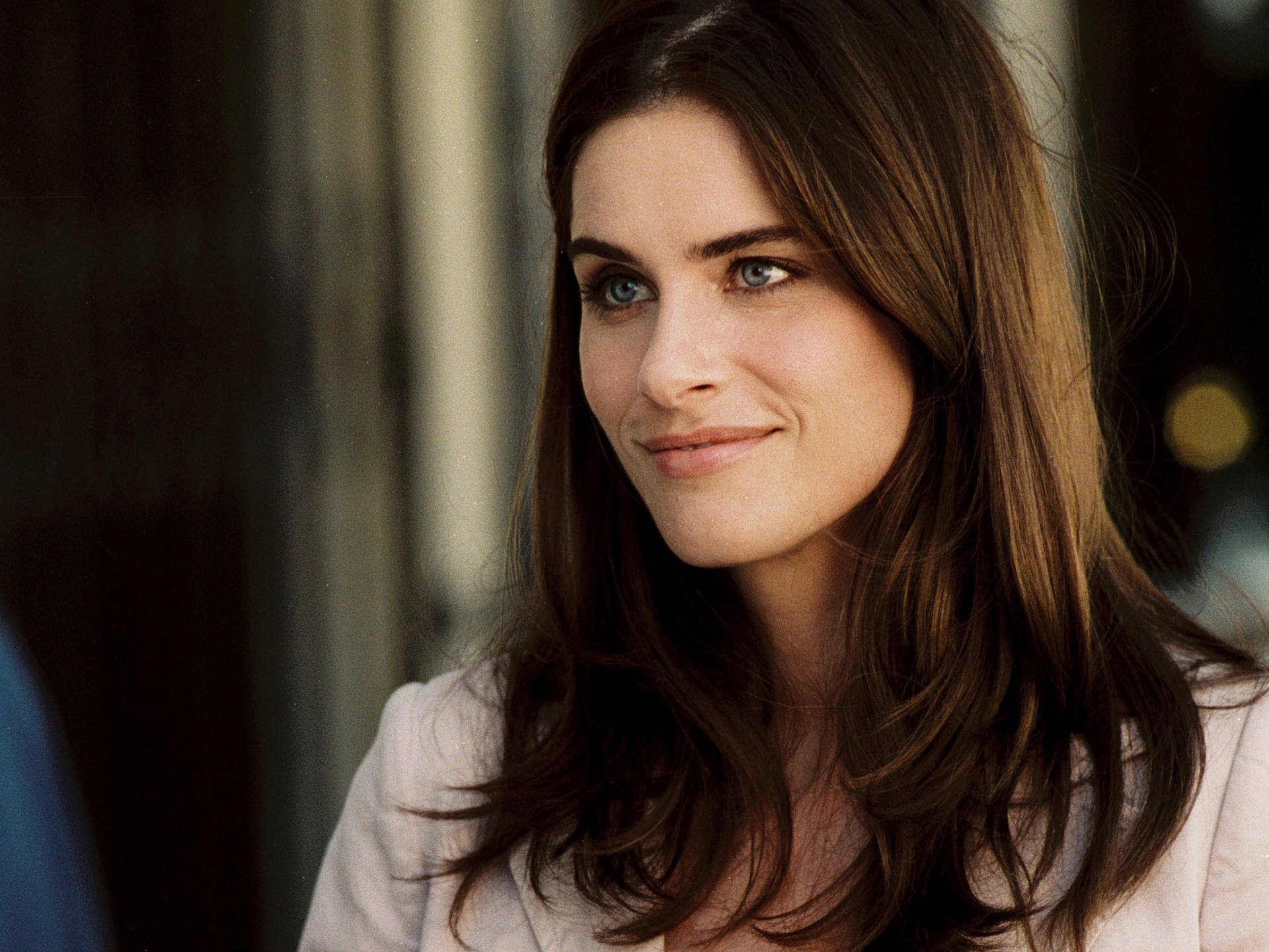 Description: A woman with a white shirt and a tie on smiling at the camera with a man in the background.