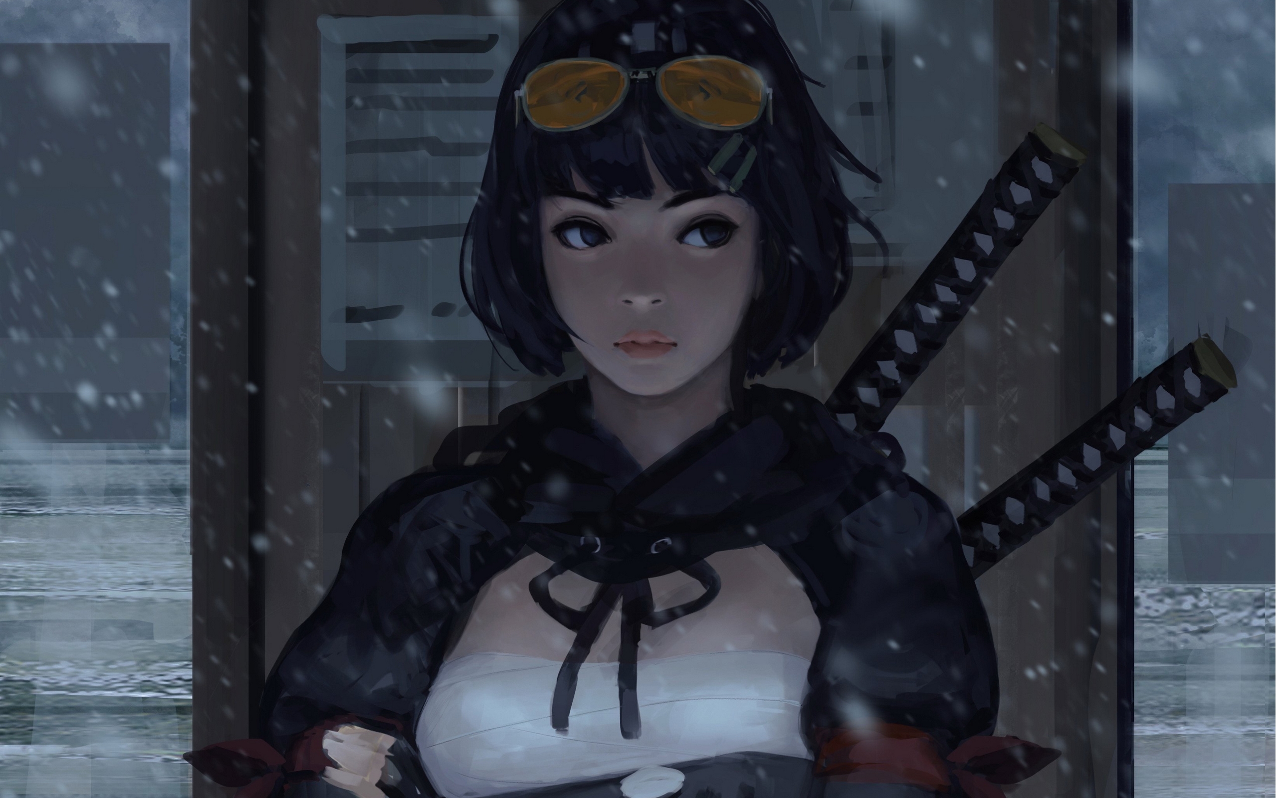 Description: A woman in a white top and black skirt holding a baseball bat in the snow with a building in the background.