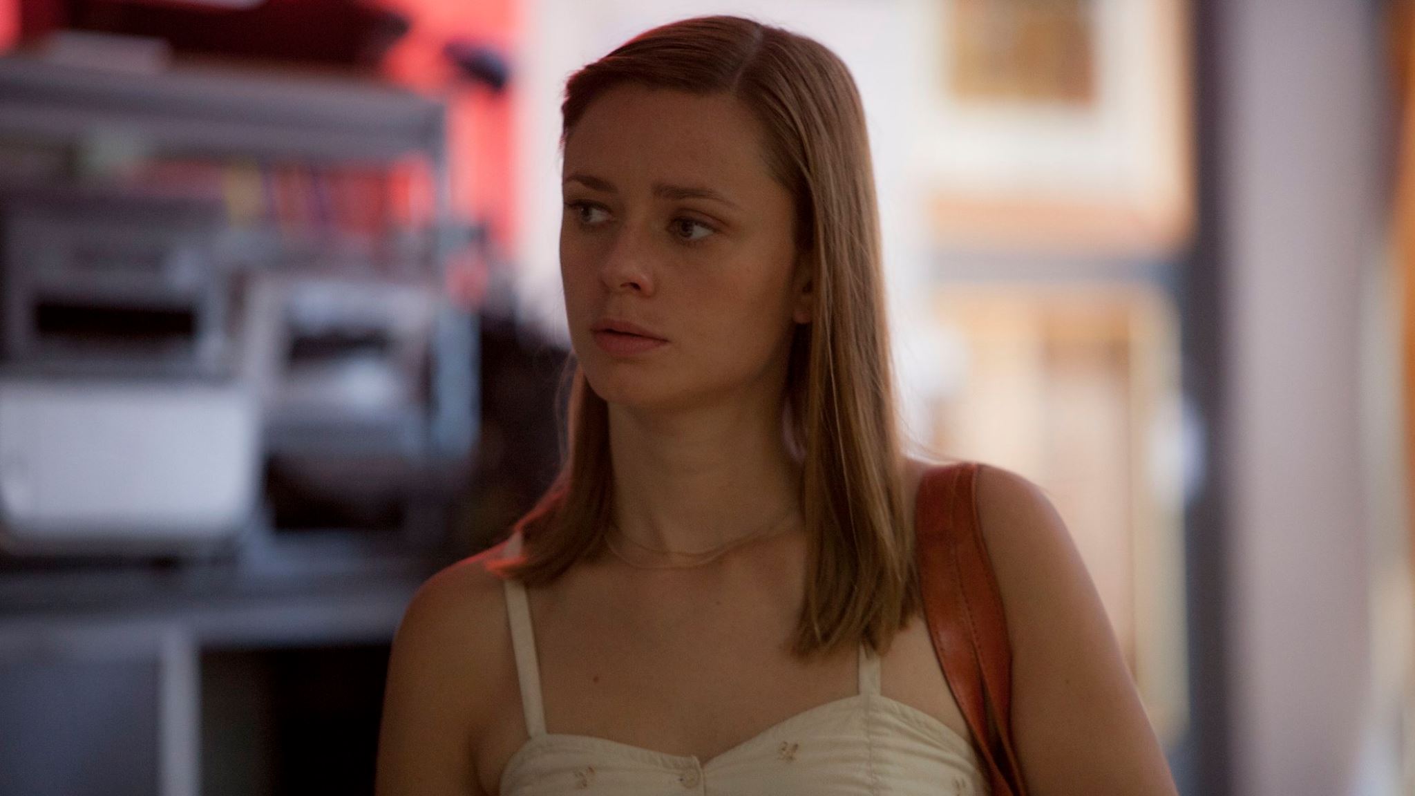Description: A woman in a white top is looking at something in the distance with a handbag on her shoulder.