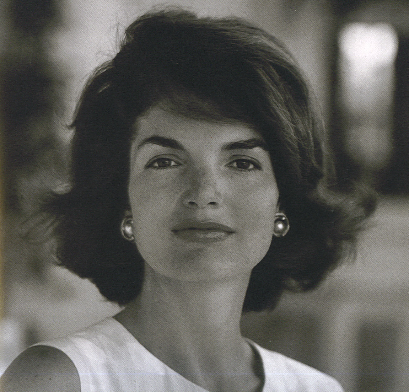 Description: A woman with a white top and earrings on her head looking up at the camera with a serious look on her face.