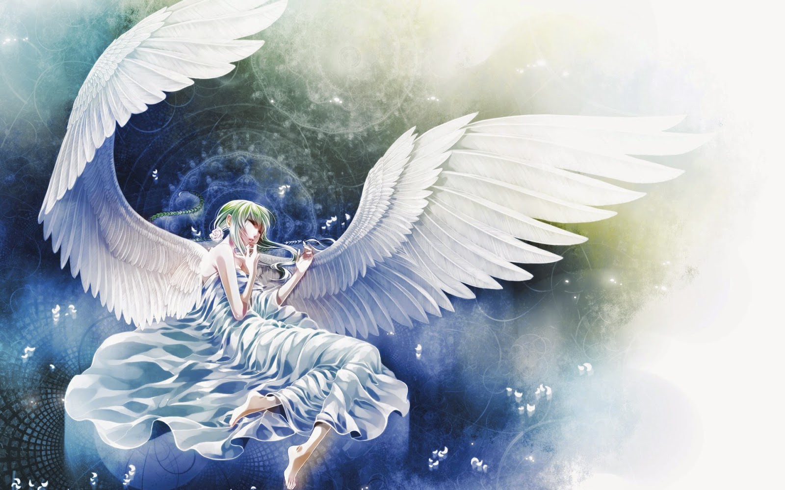 Description: A woman with white wings sitting on a cloud filled sky with a book in her hand and a book in her other hand.