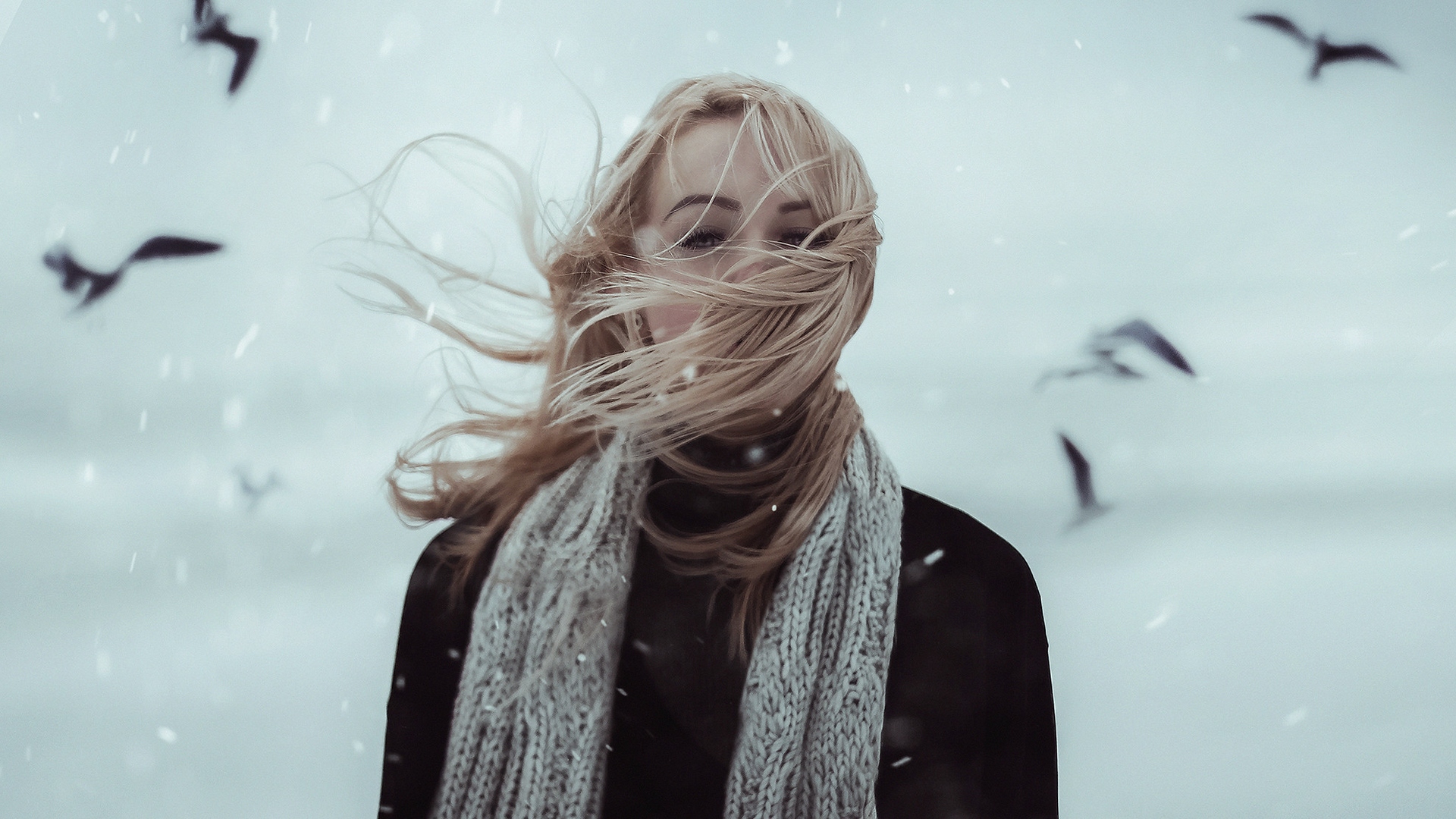 Description: A woman with her hair blowing in the wind in the snow with birds flying overhead in the background and a white sky.
