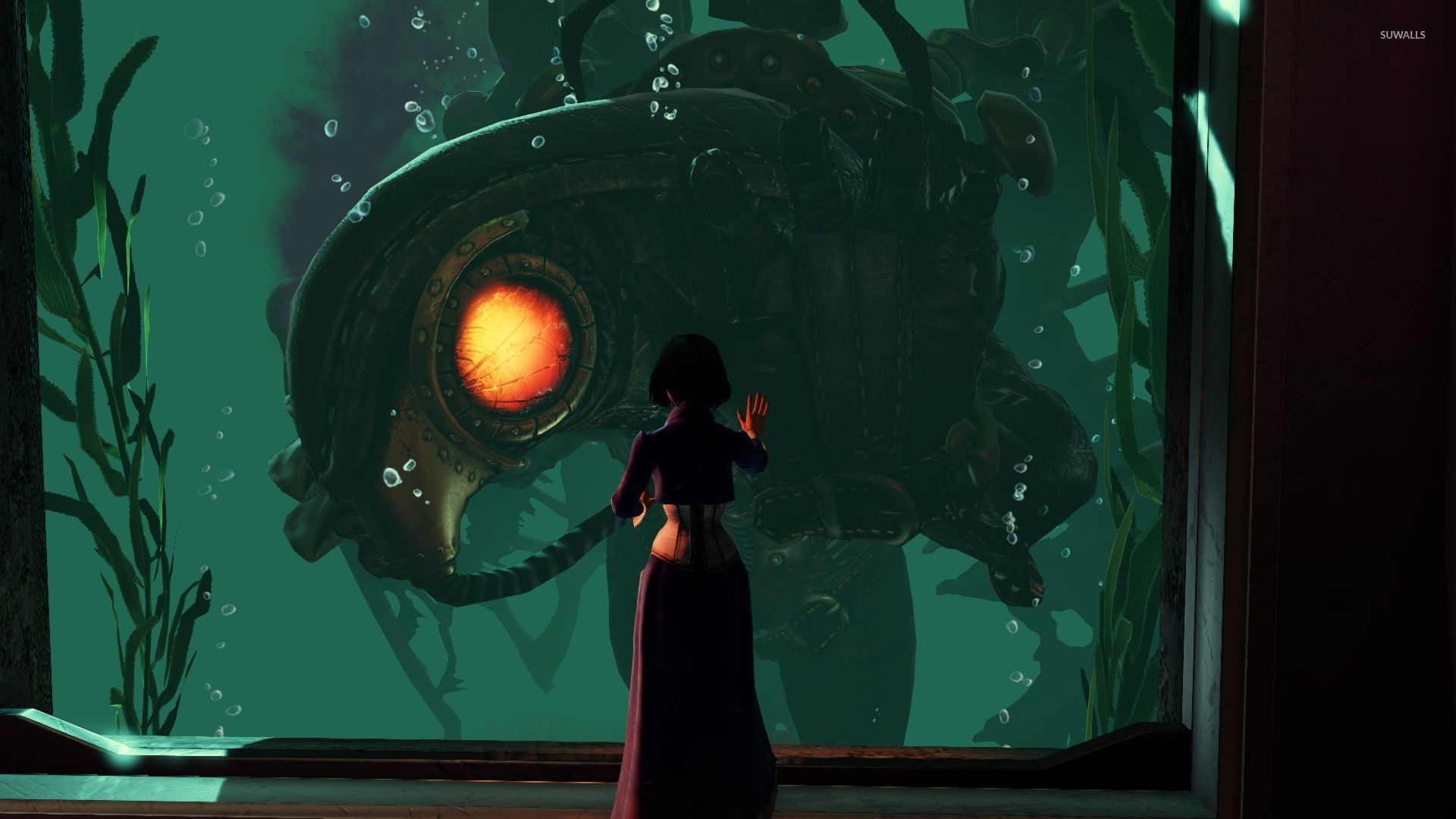 Description: A woman standing in front of a window looking at a giant fish in a green aquarium with a giant fish in the background.