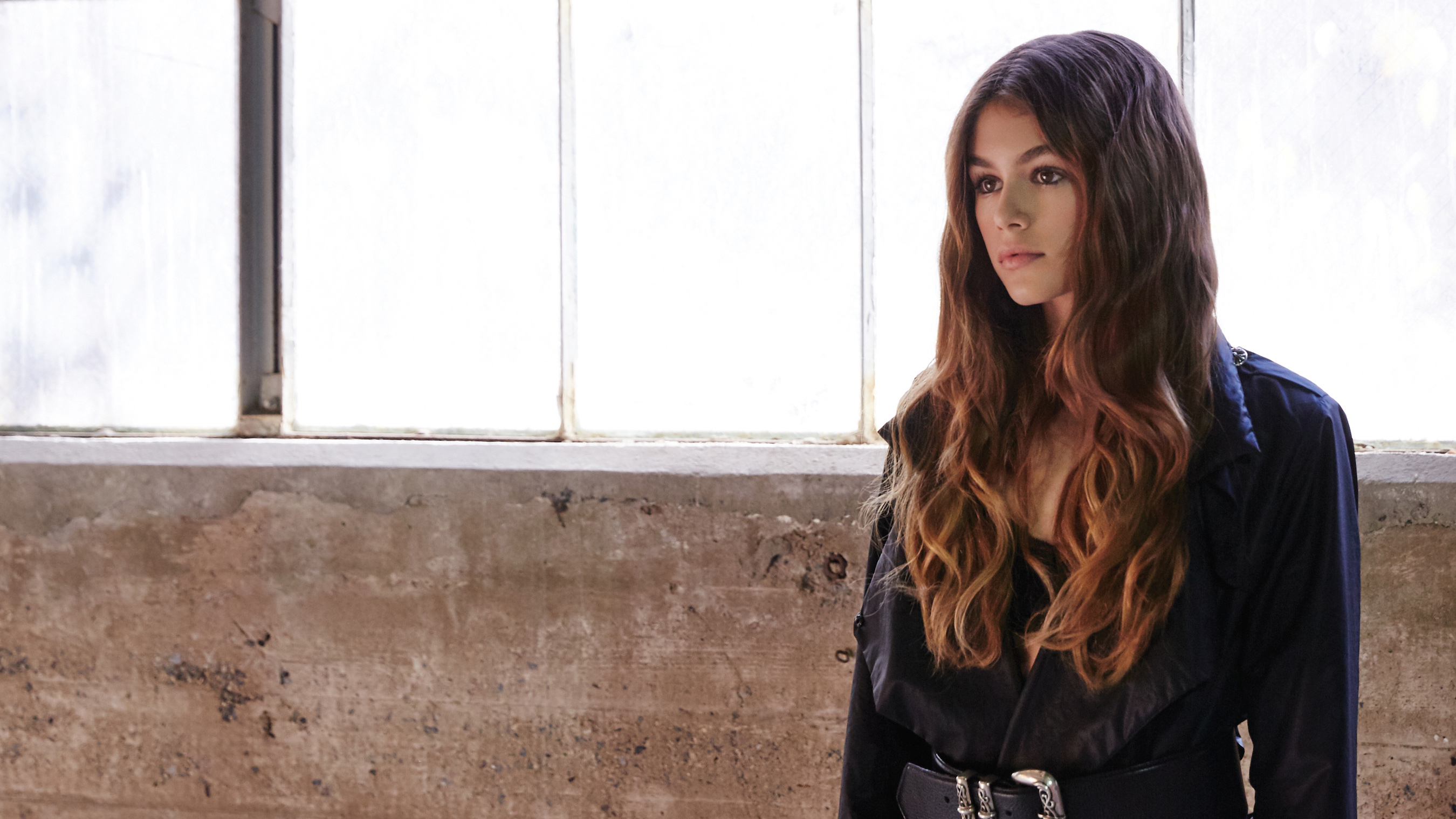 Description: A woman standing in front of a window with a black shirt on and a belt around her waist and a black shirt on.