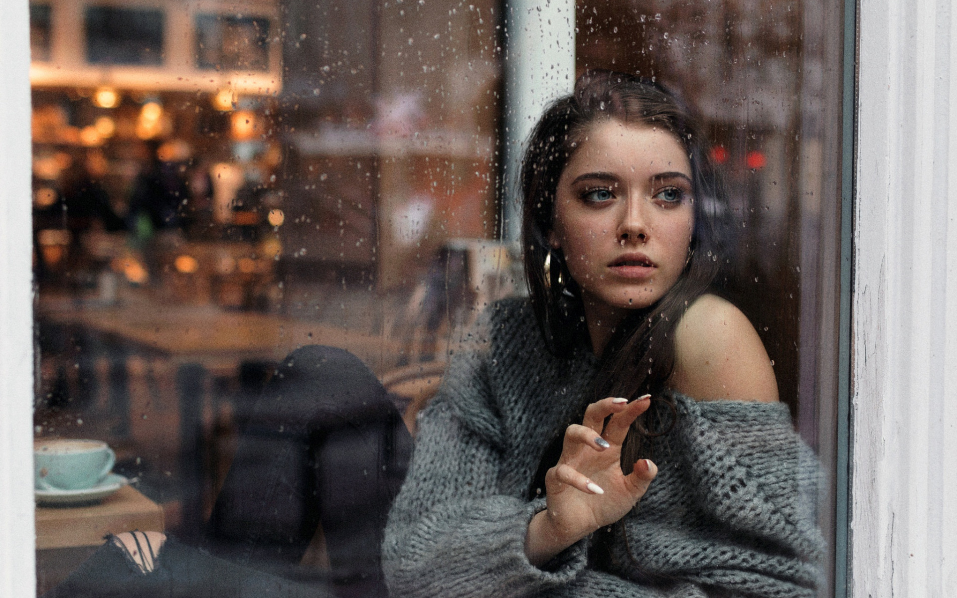Description: A woman sitting in a window looking out at the street outside of a cafe with a cup of coffee.