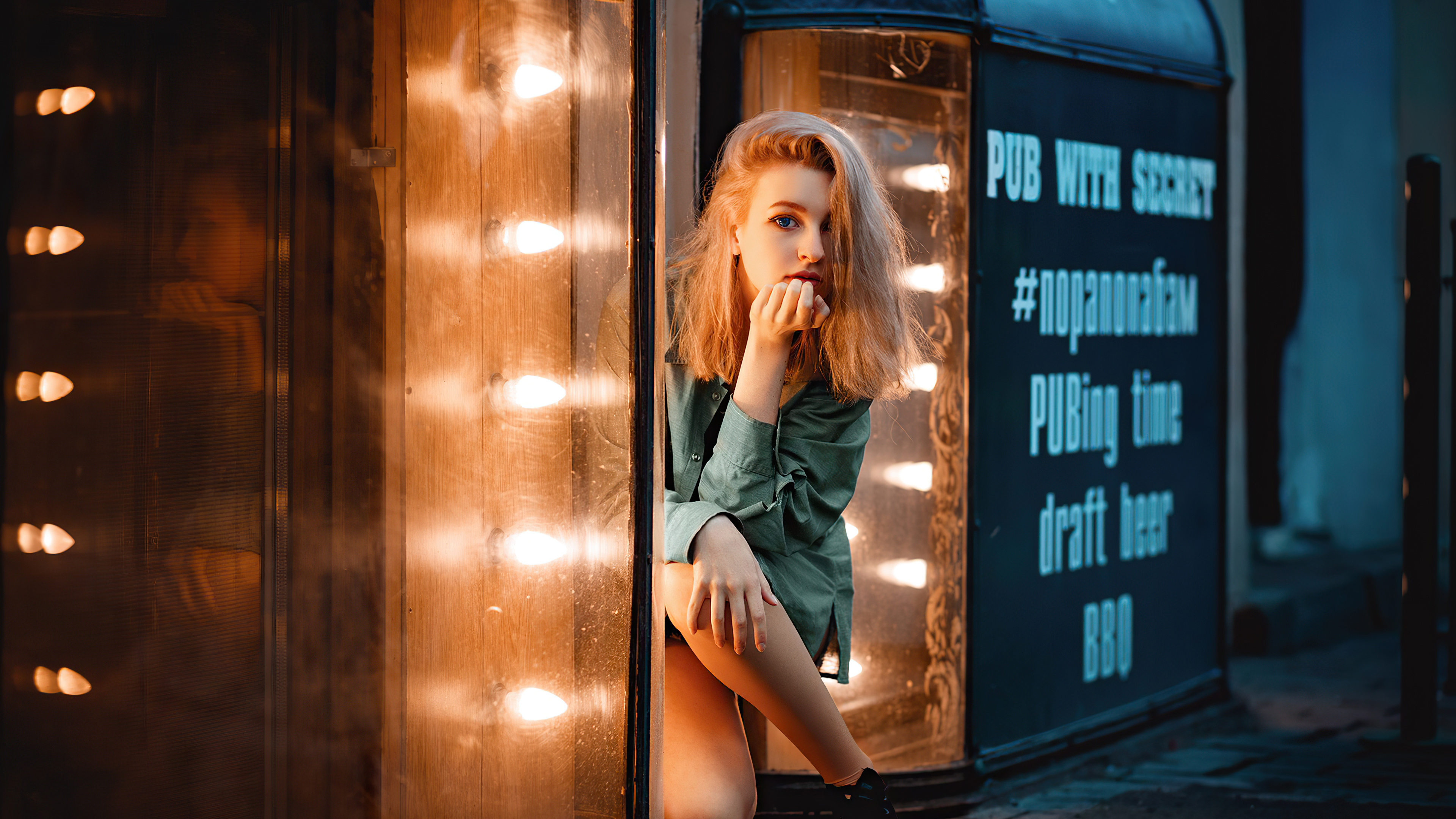 Description: A woman sitting on a window sill with a light on behind her and a sign behind her that says.