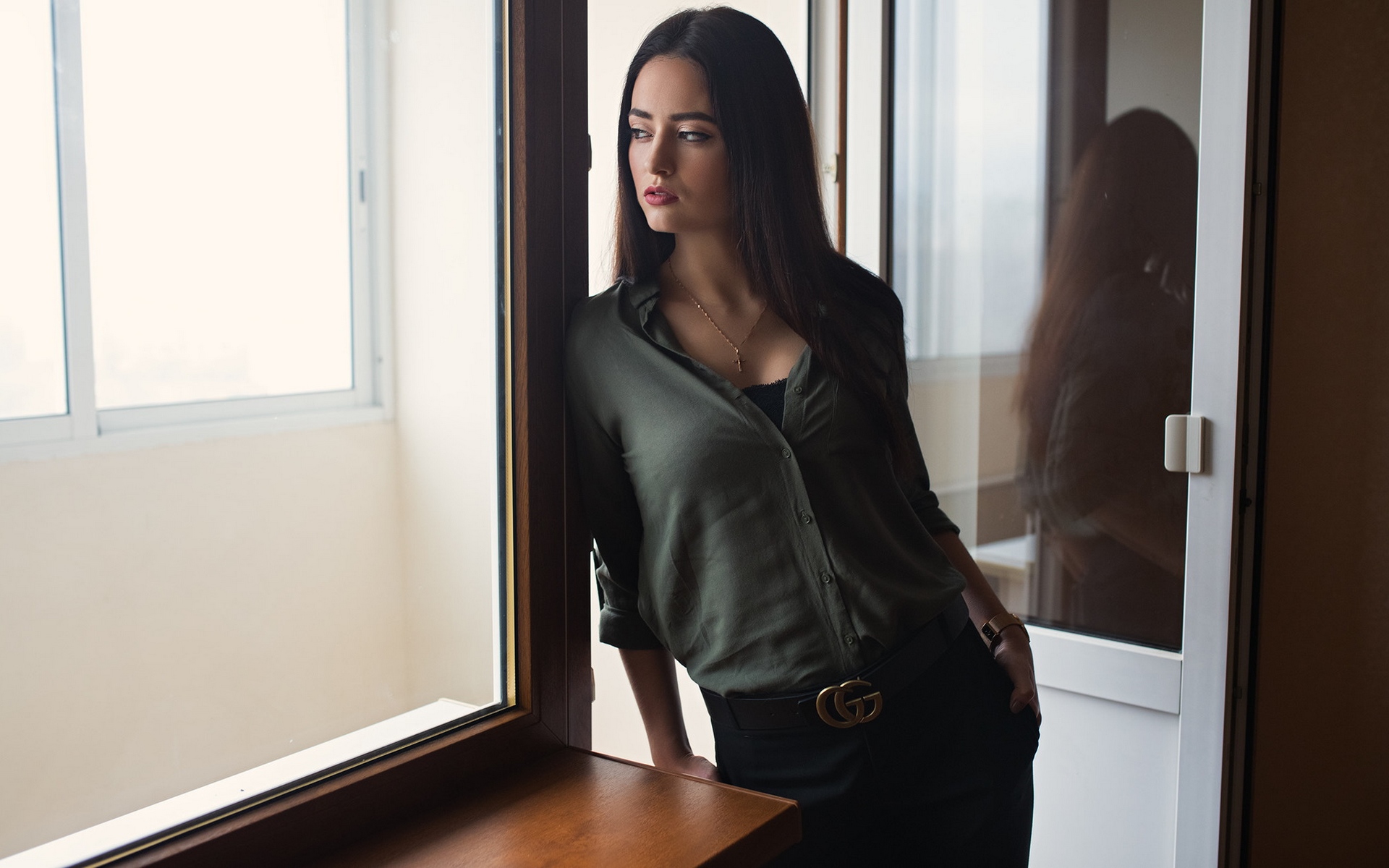 Description: A woman standing in front of a window next to a wooden table and a window sill with a glass.