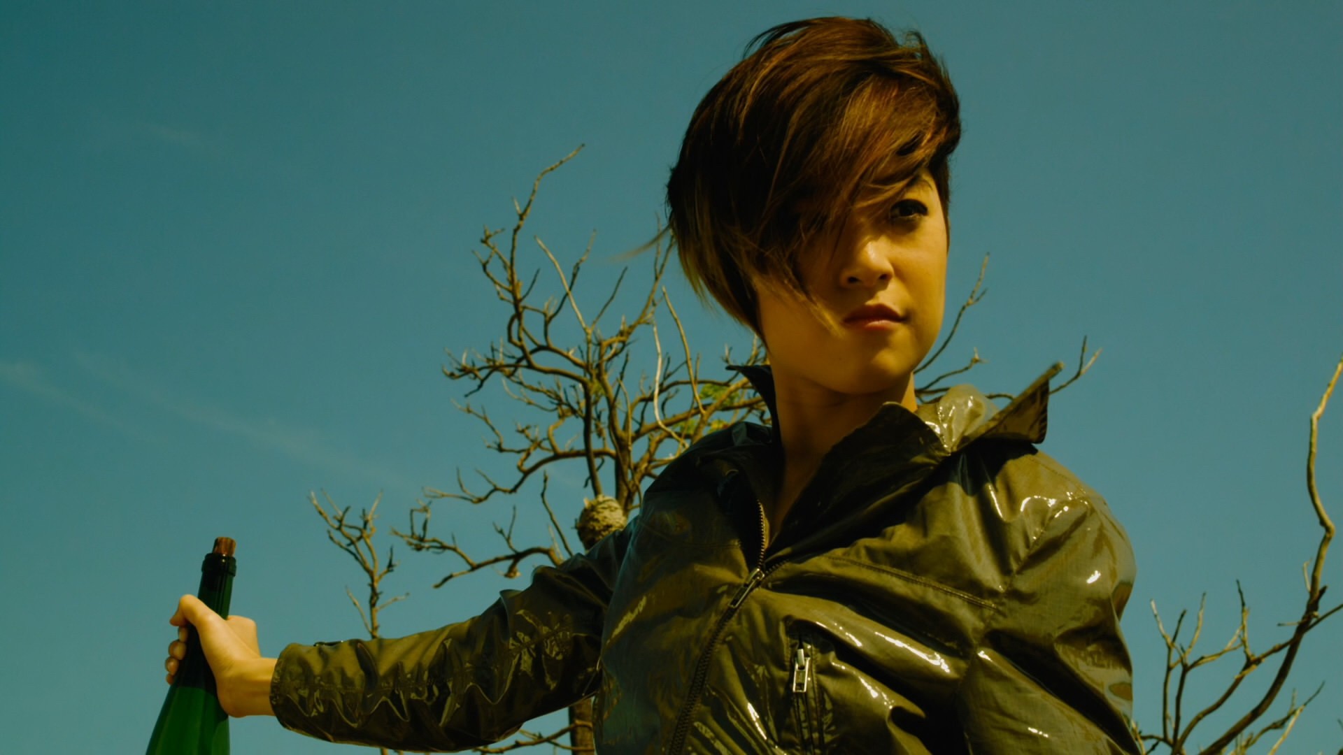 Description: A woman holding a bottle of wine in her hand and a tree in the background with no leaves on it.