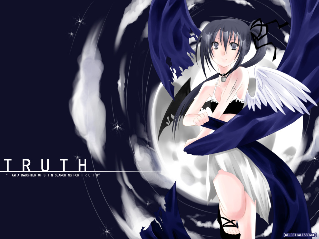 Description: A woman with wings is standing in front of a blue background with a white swirl around her and the words truth.