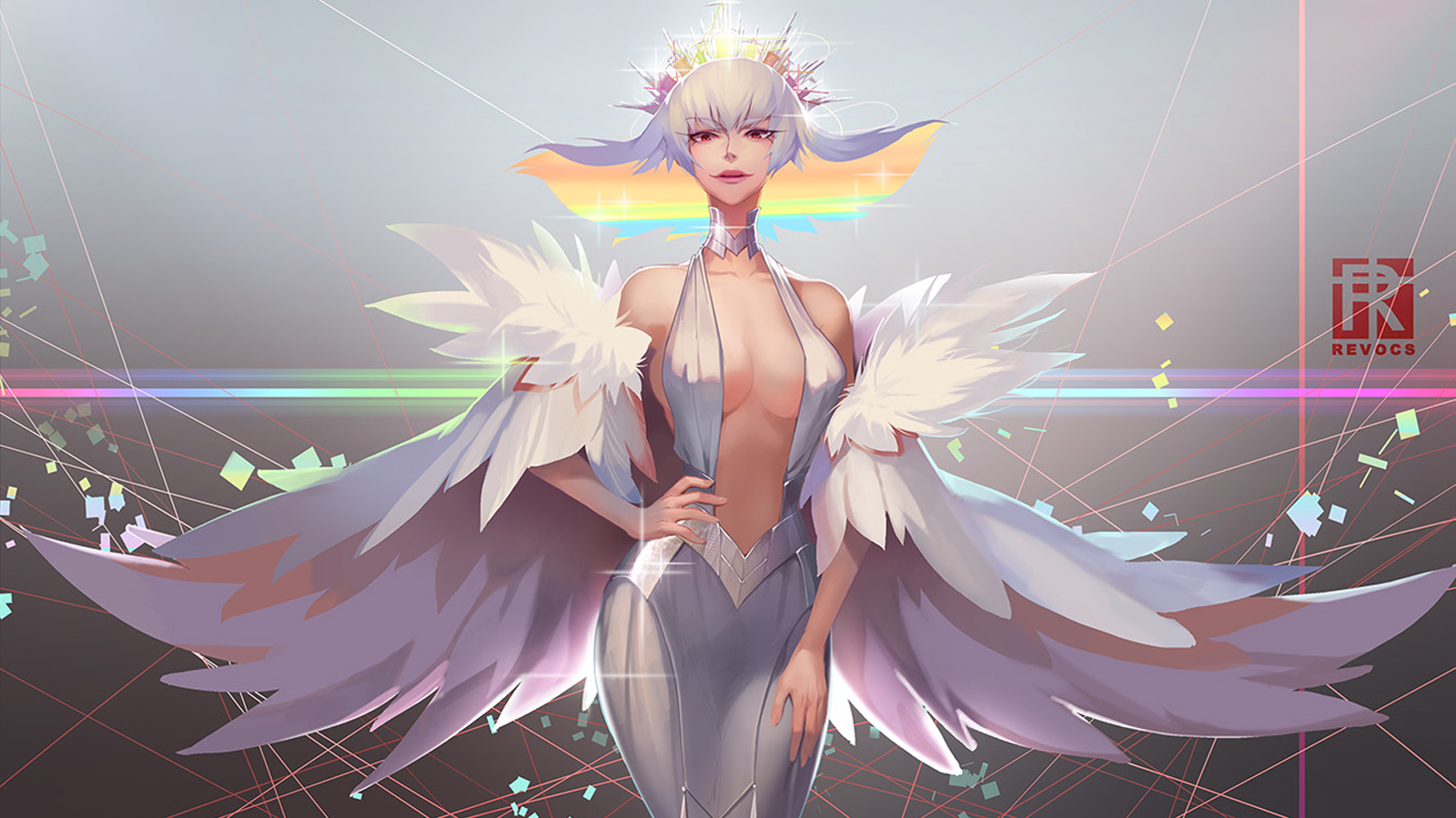 Description: A woman with wings and a crown on her head standing in front of a background of lines and shapes.