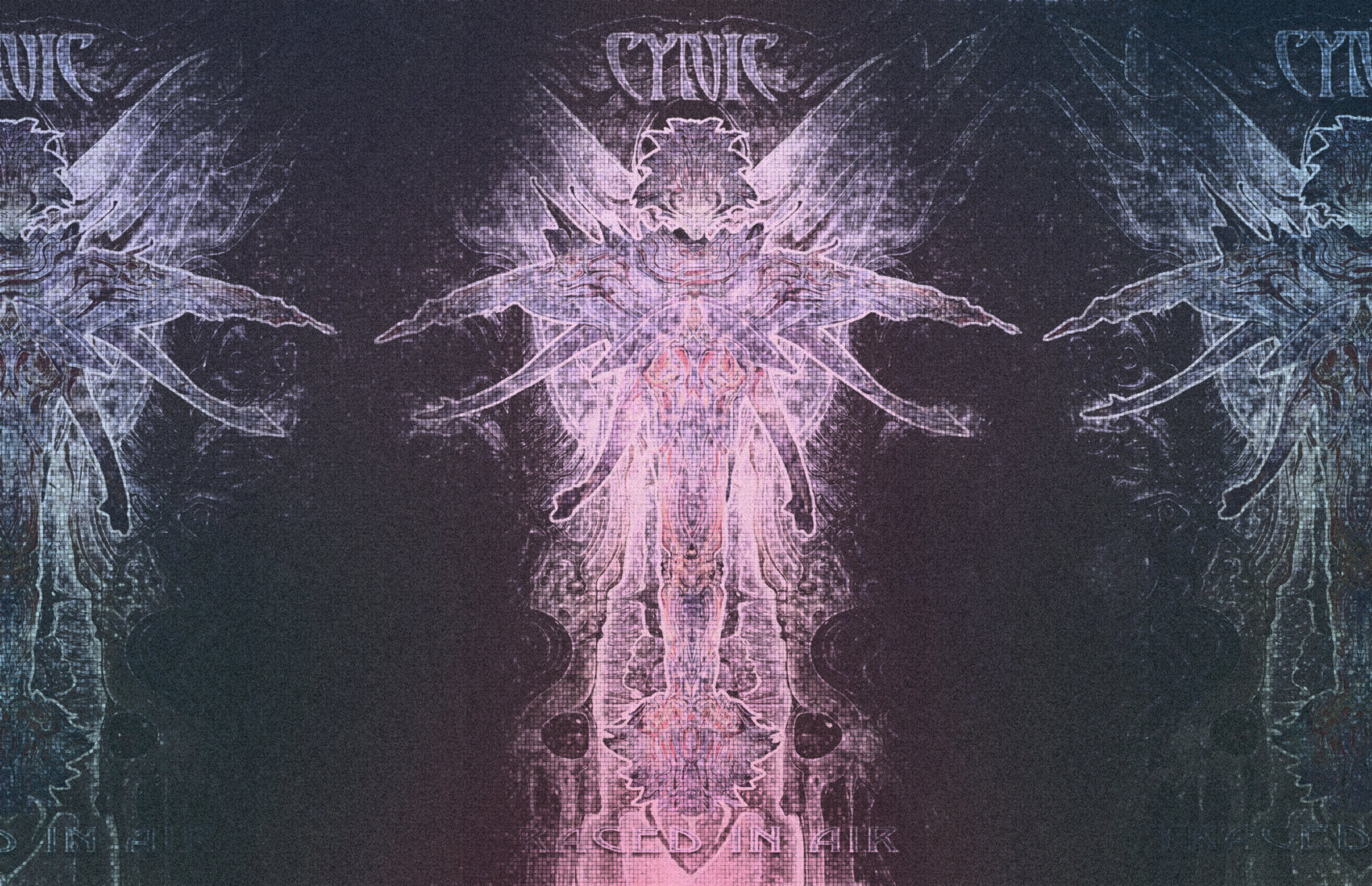 Description: A painting of a woman with wings and a halo in the center of the image is a pink and blue background.