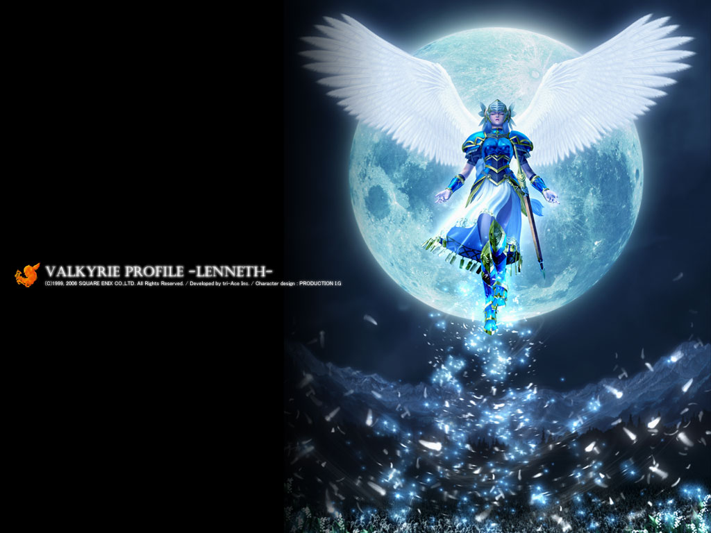 Description: A woman with wings standing on a hill with a full moon in the background and a sky background with stars.