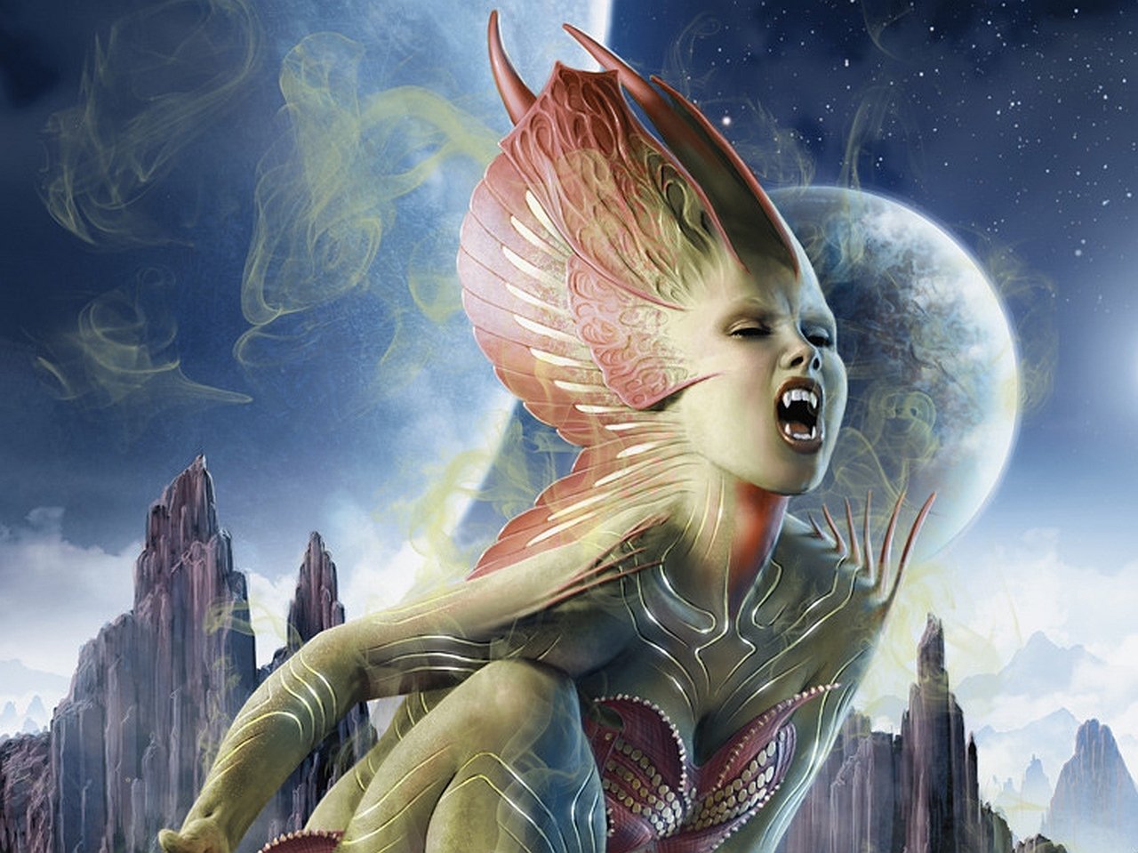Description: A woman with a large body and wings on her back in front of a mountain landscape with a moon and a full moon.