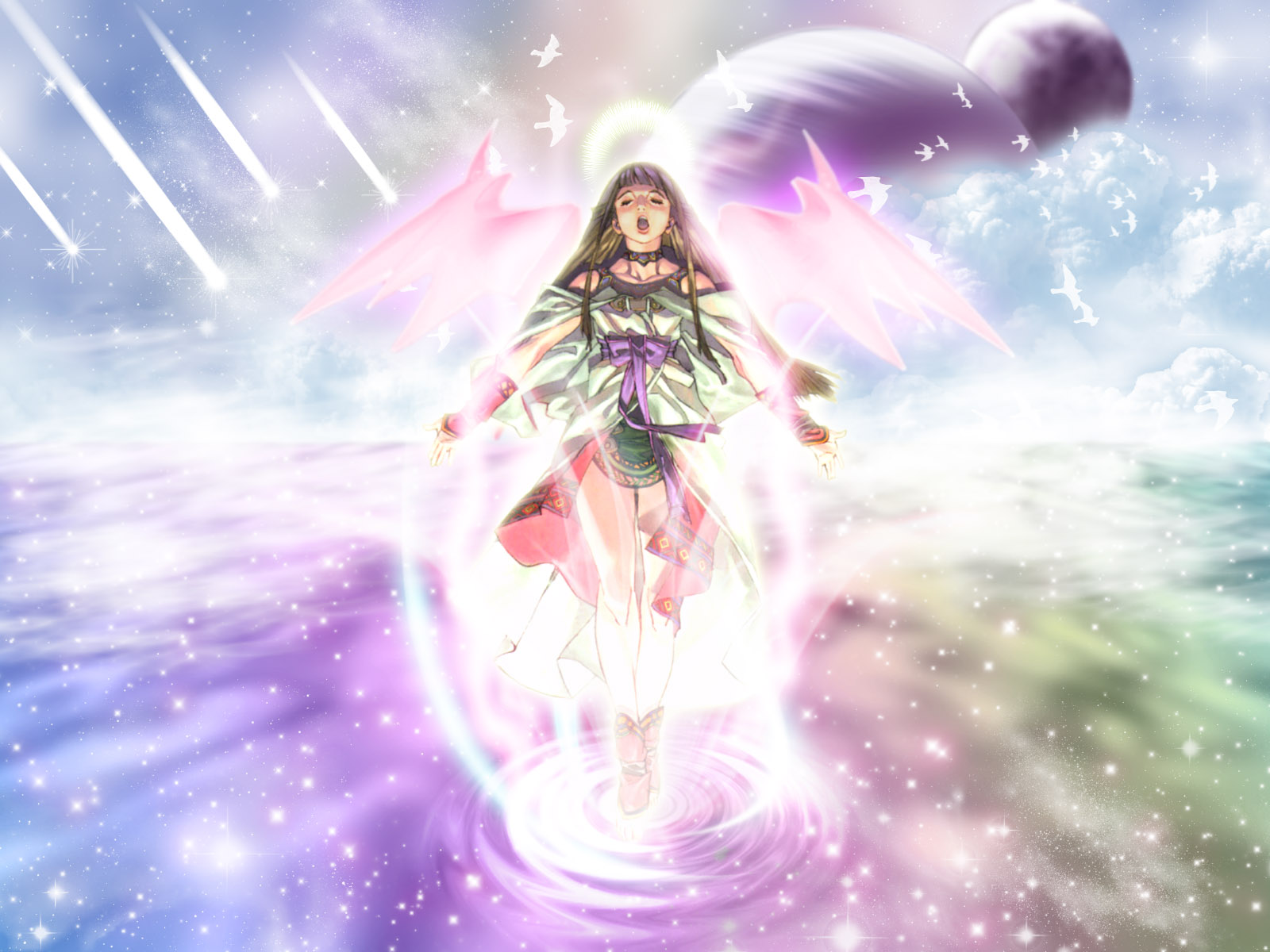 Description: A woman with wings standing on a wave in the ocean with a sky background and stars above her.
