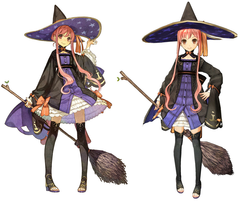 Description: A woman in a witch costume holding a broom and a broomstick in her hand and a witch hat on her head.