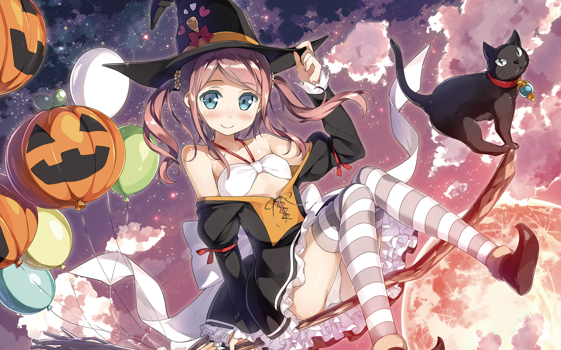 Description: A woman in a witch costume is flying with a cat on her back and a cat on her shoulder.