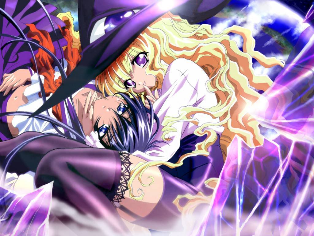 Description: A woman in a witches costume with a hat on her head and a purple umbrella over her head.