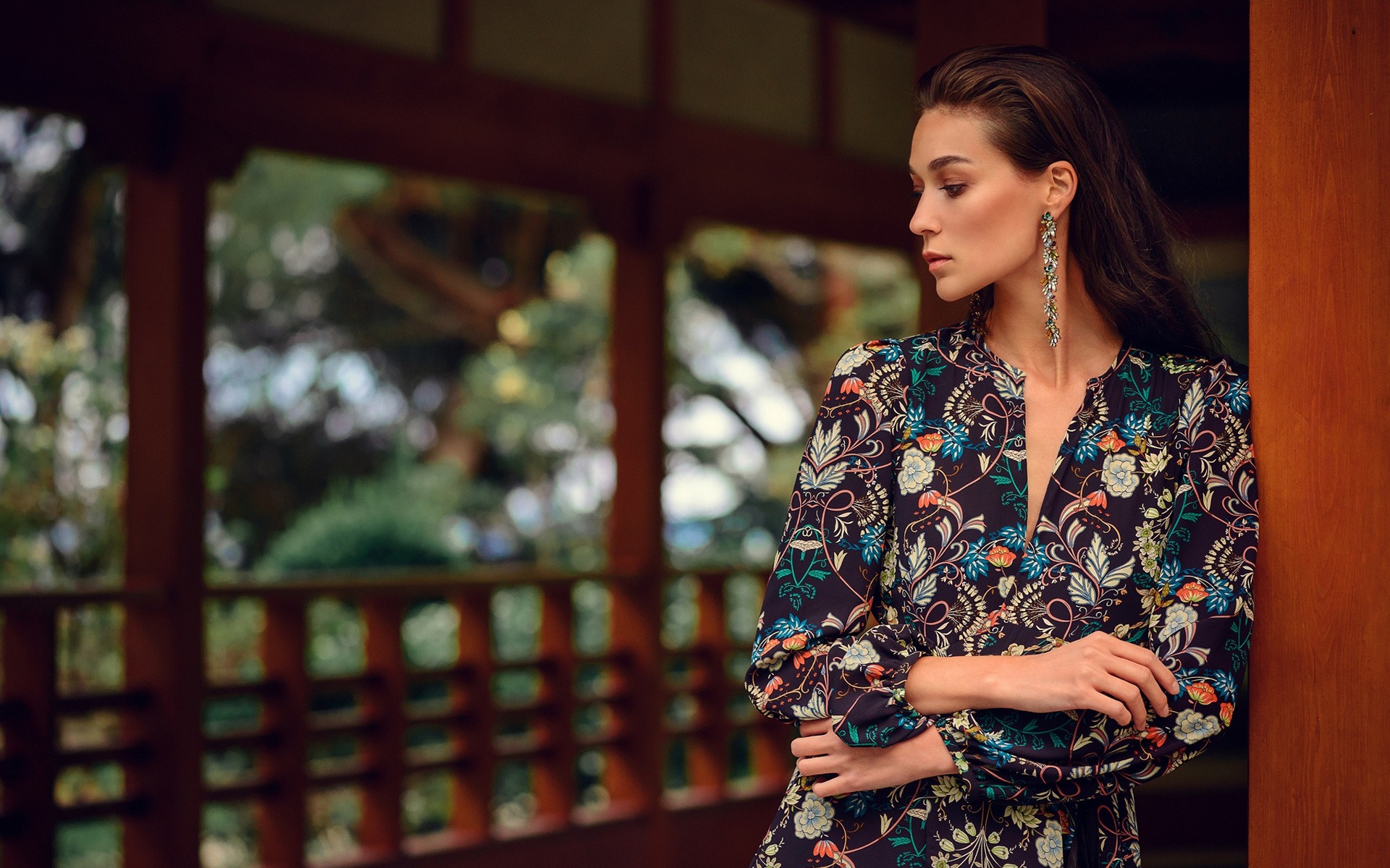 Description: A woman standing in front of a wooden structure with her arms crossed and her head turned to the side.