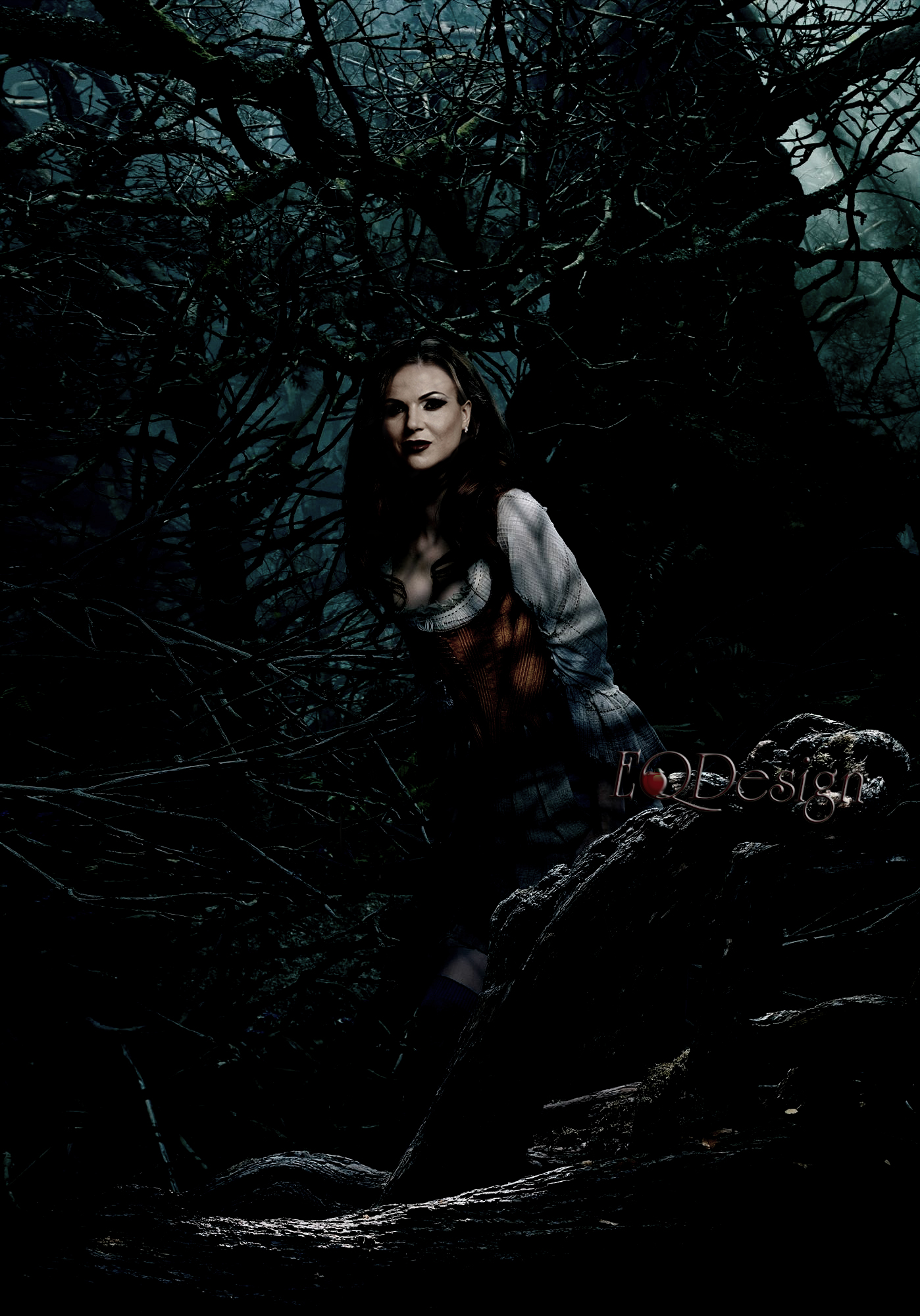 Description: A woman standing in the woods with a knife in her hand and a creepy look on her face.