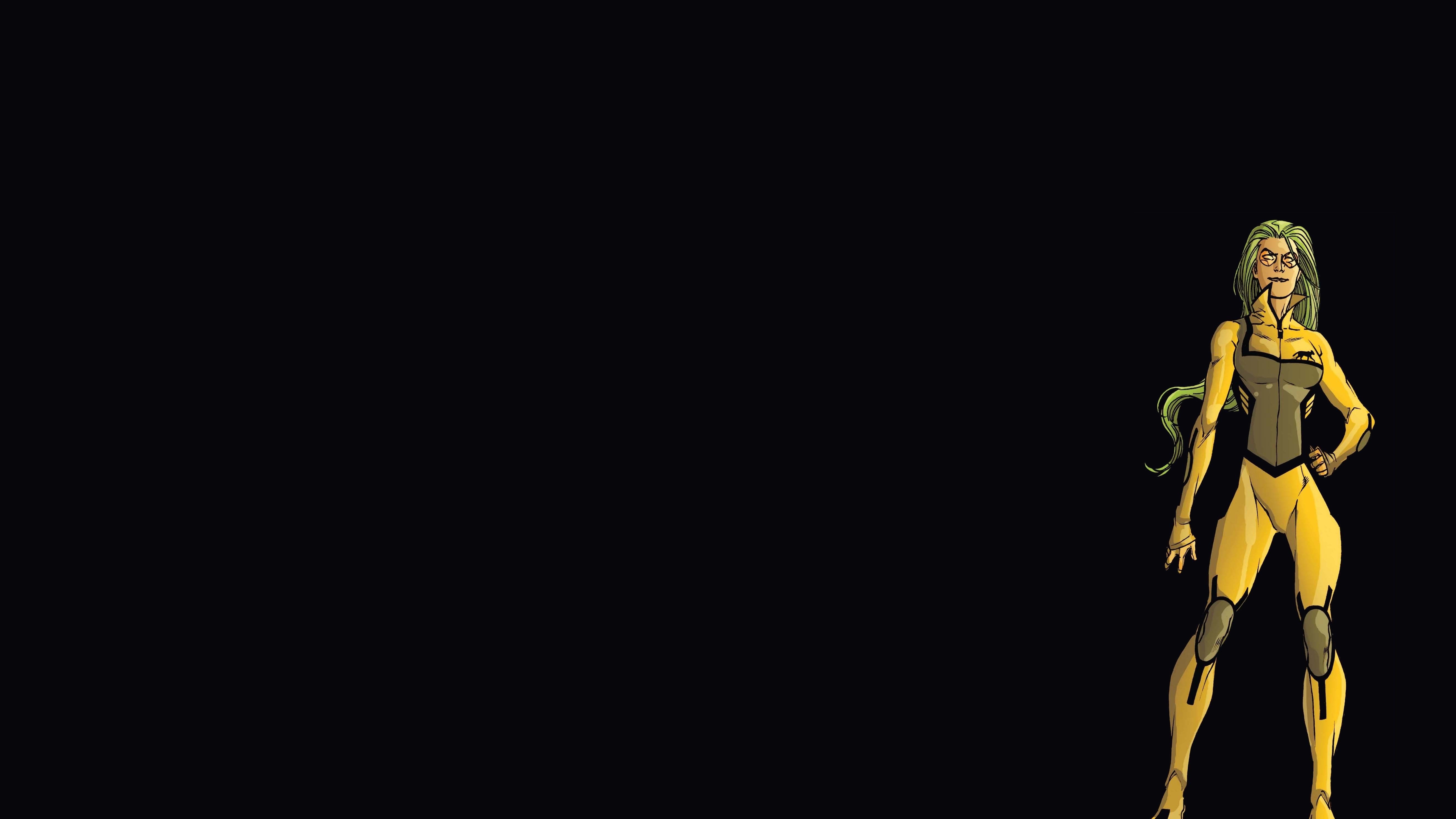 Description: A woman in a yellow and black suit standing in the dark with her hands on her hips and her legs crossed.